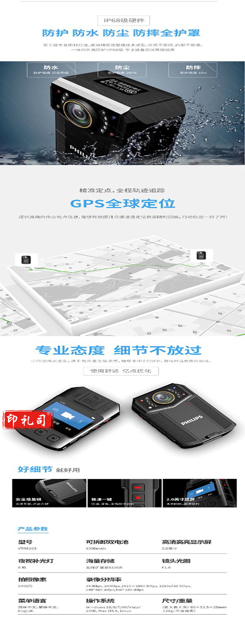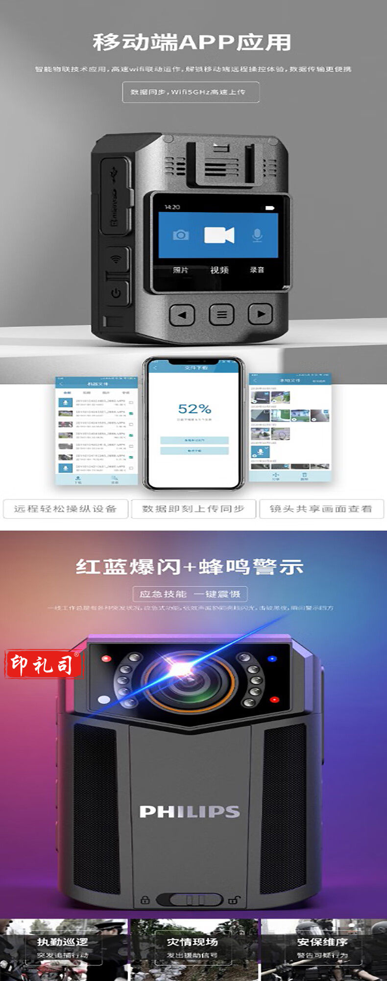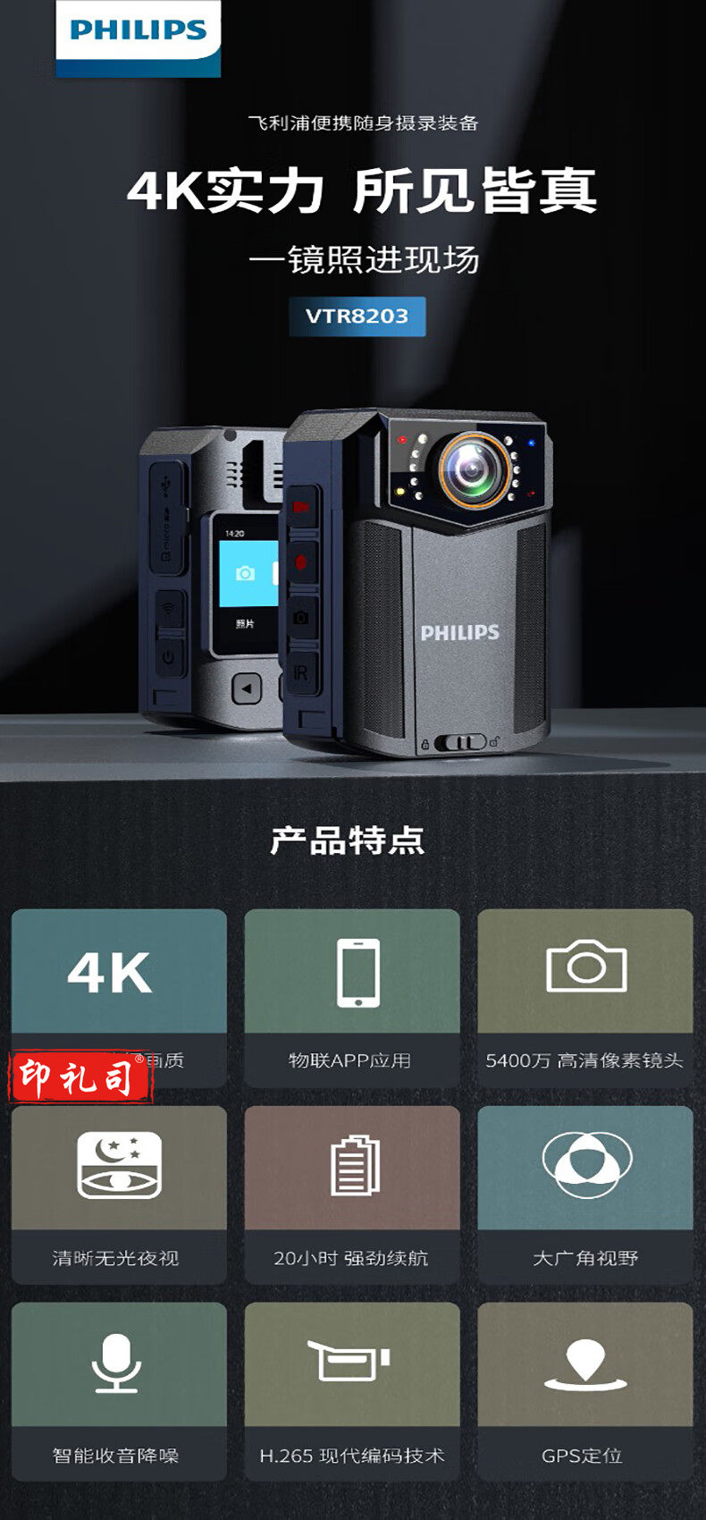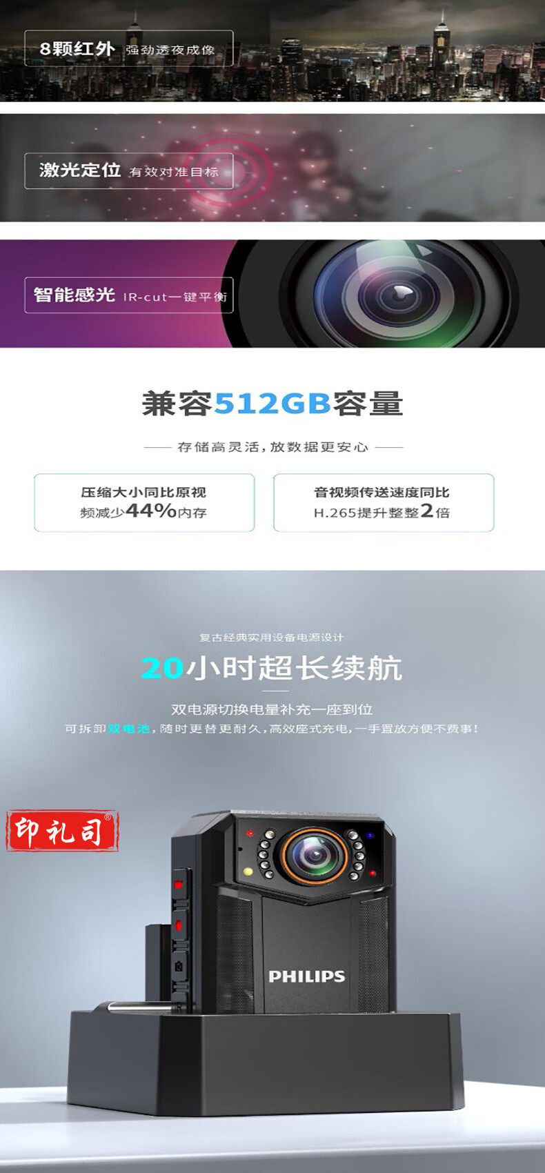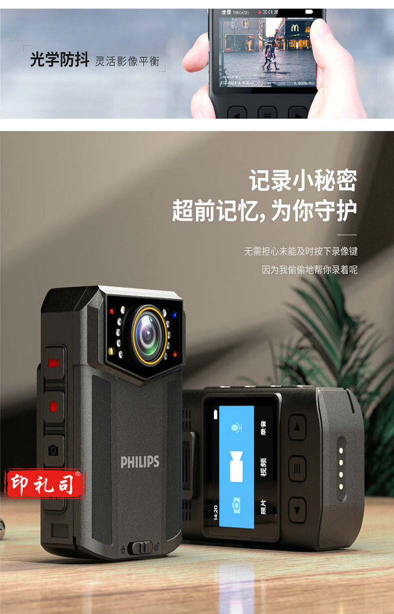 飞利浦(PHILIPS)VTR-8203随身执法记录仪 4K摄像GPS手机APP操控5400万高清拍照运动相机64G扩展