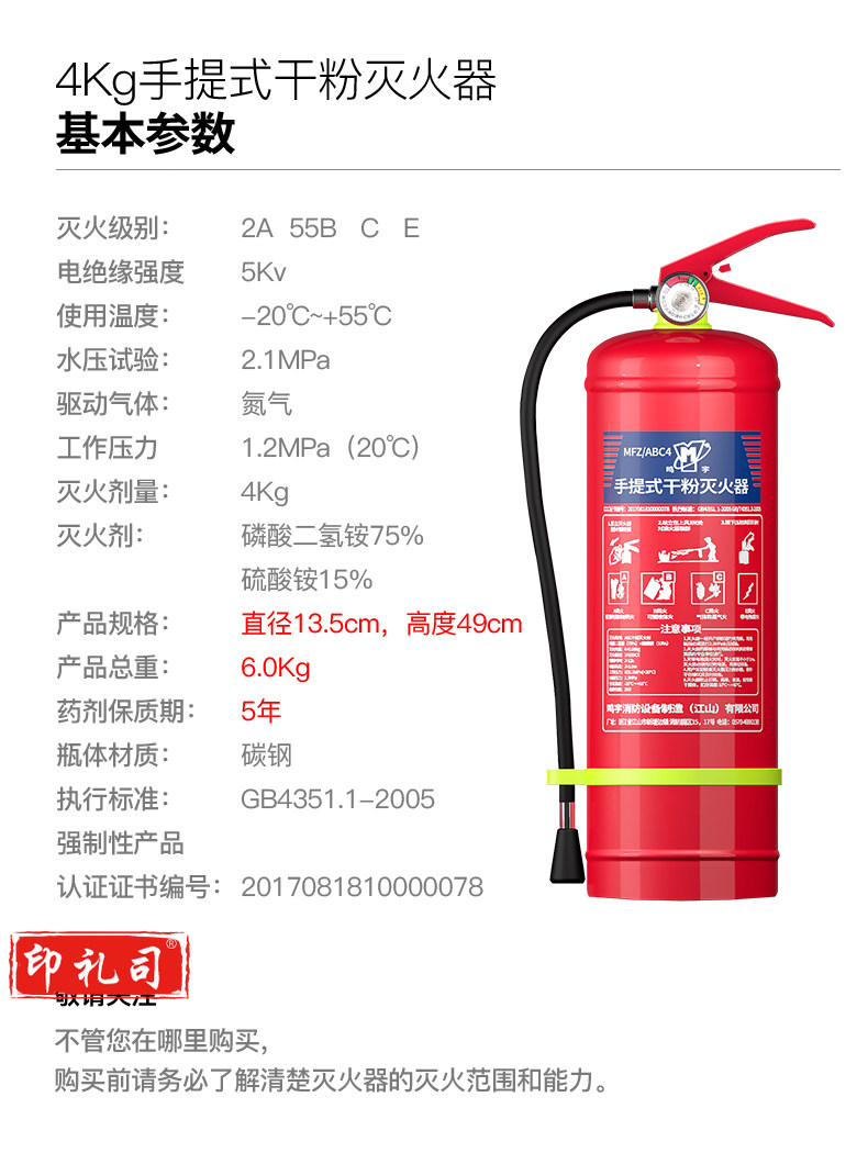 商品名称:神速SS-4KG 商品编号:100015083164 商品毛重:6.2kg 商品产地:上海 容量:1-5kg 适用场景:抢险救灾,物流仓储,房产物业,铁路地铁,农林牧副渔,家用 类别:灭火器 灭火器类型:干粉灭火器 类型:其他