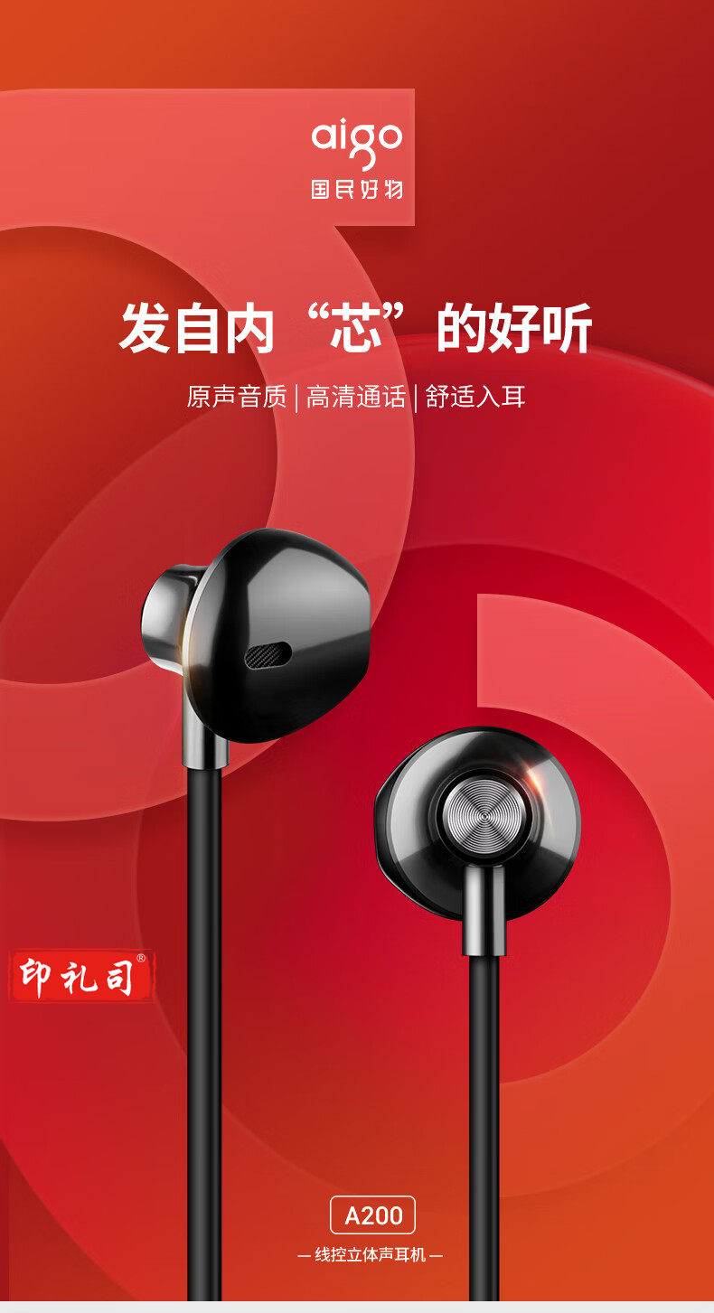 aigo 爱国者A200 有线耳机半入耳式 重低音耳麦带麦线控大动圈 通用手机电脑华为苹果适用耳机 黑色