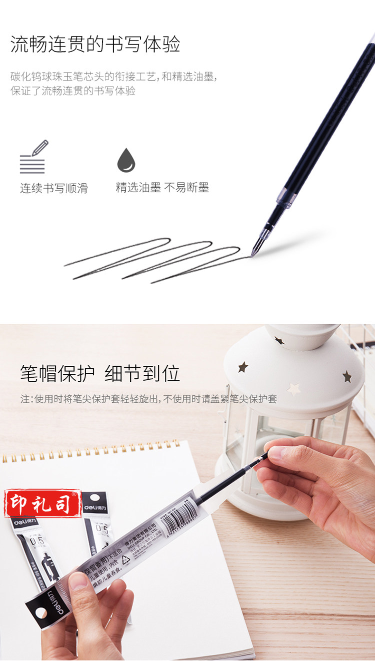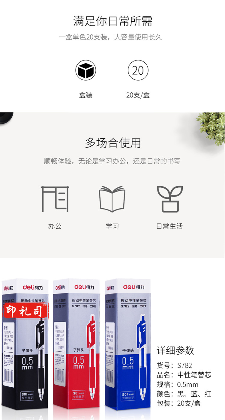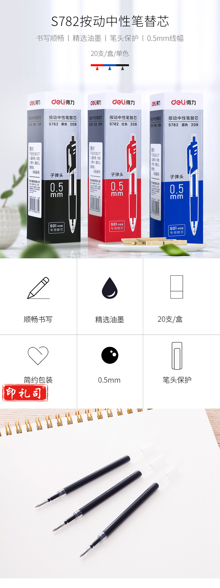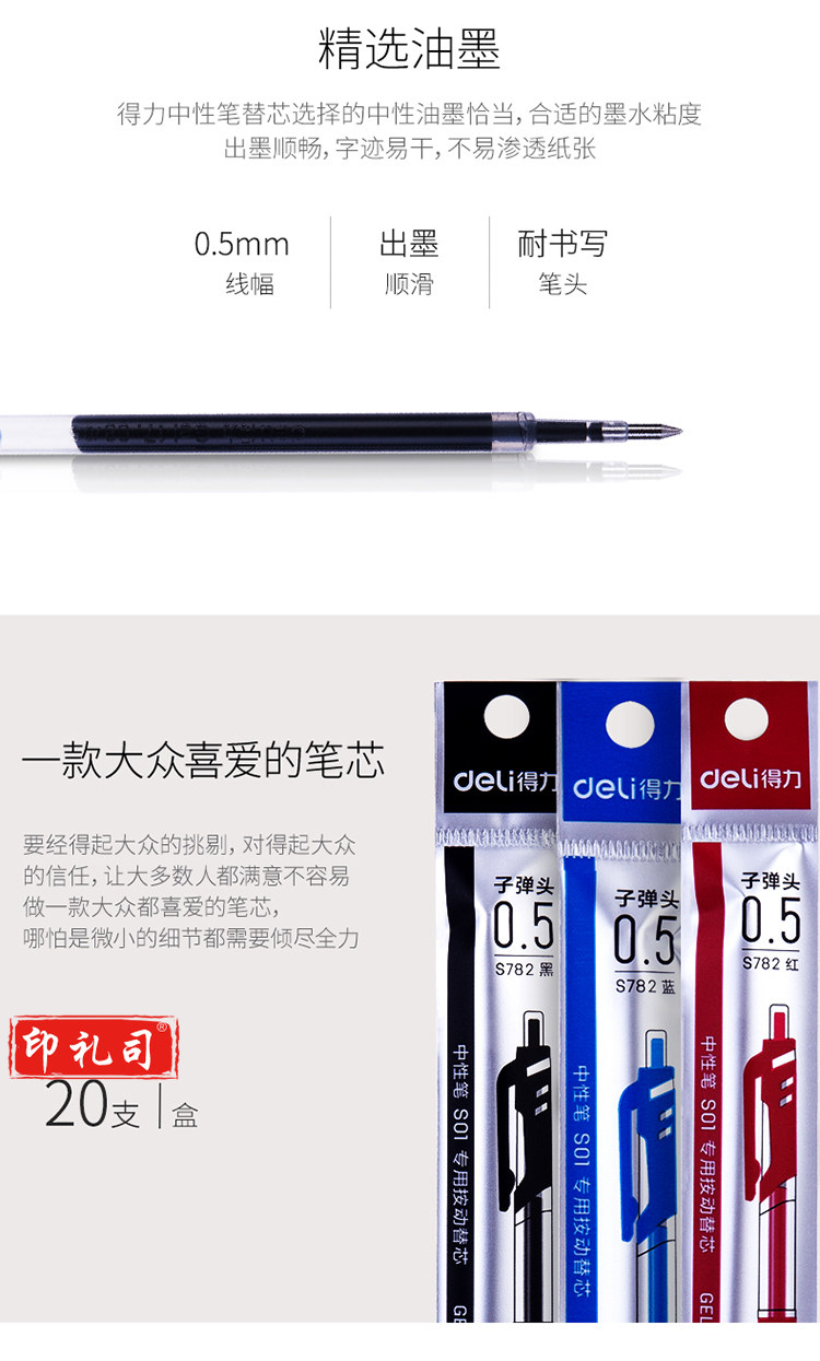 得力 deliS782按动中性笔水笔笔芯头0.5mm黑色20支/盒 办公用品 S782 20支装(黑、红,下单备注颜色)