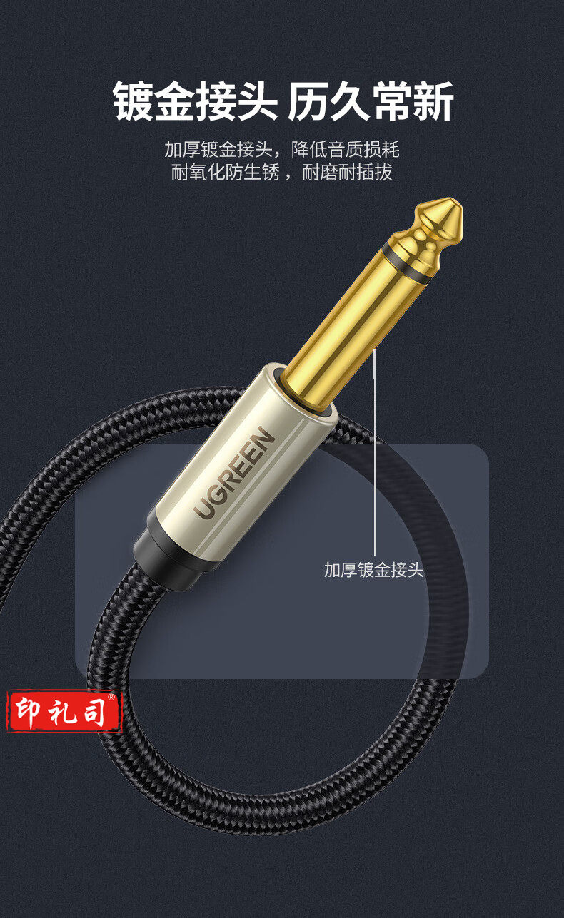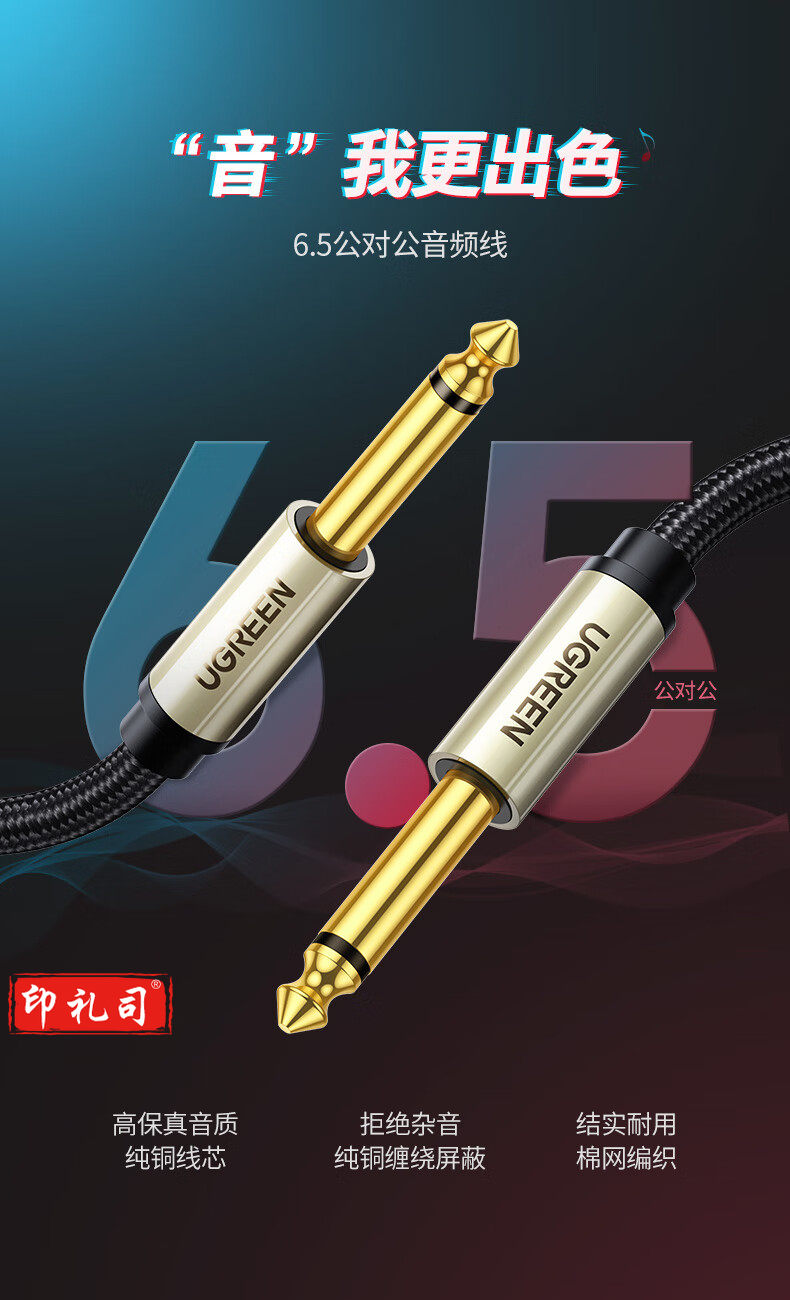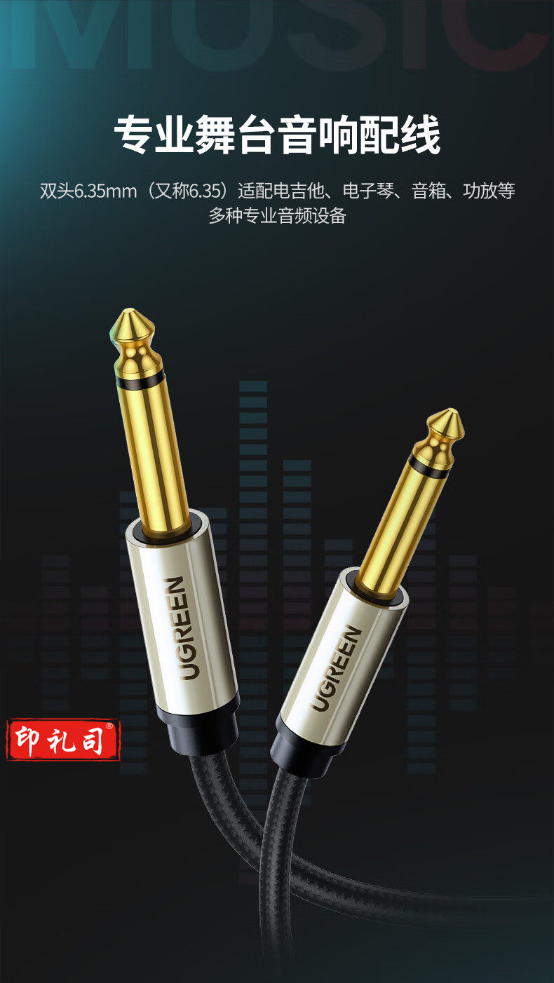 绿联6.5mm音频线6.35大二芯公对公连接线对录线 音响音箱功放麦克风电子琴鼓调音台转接线1米