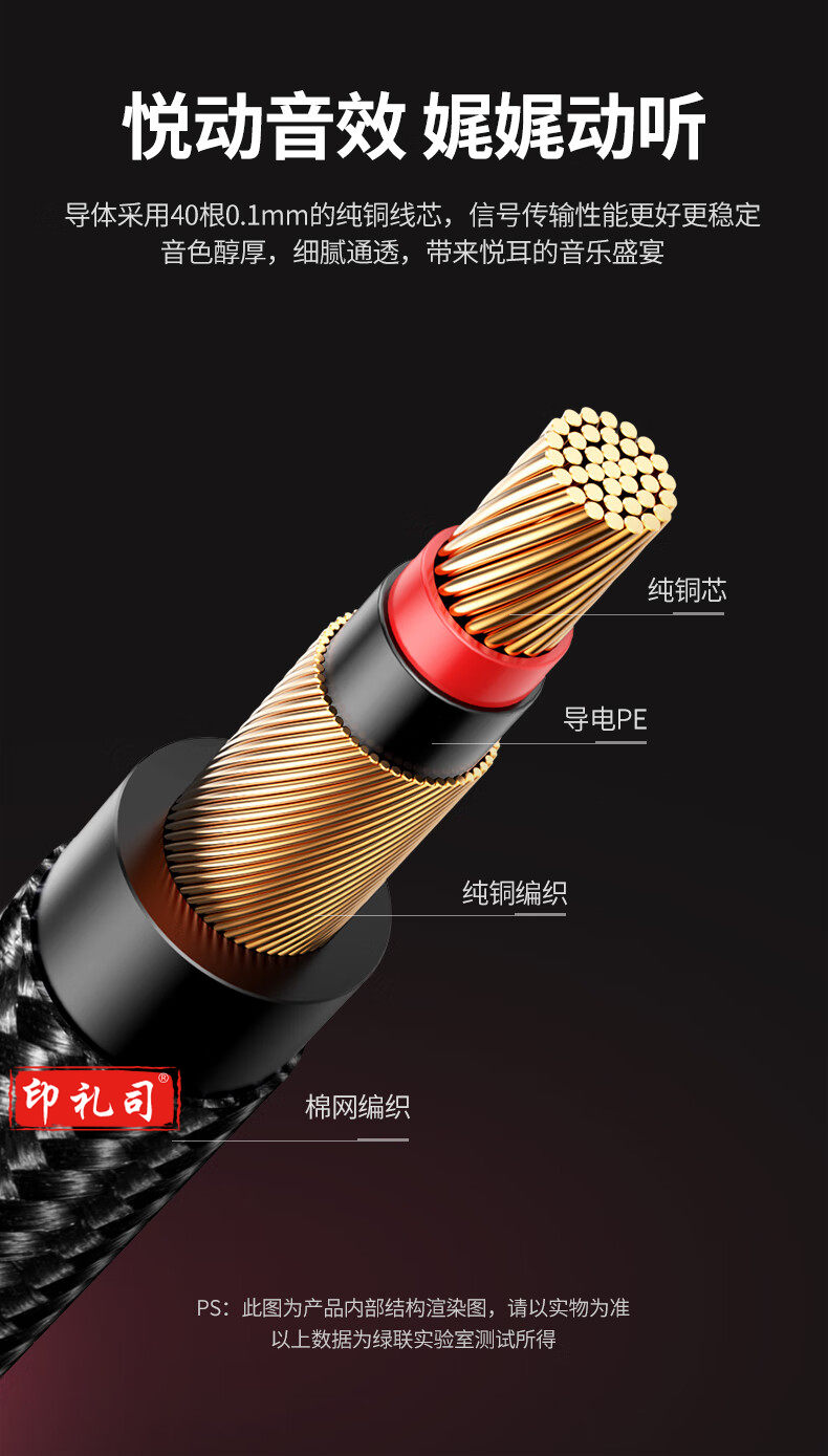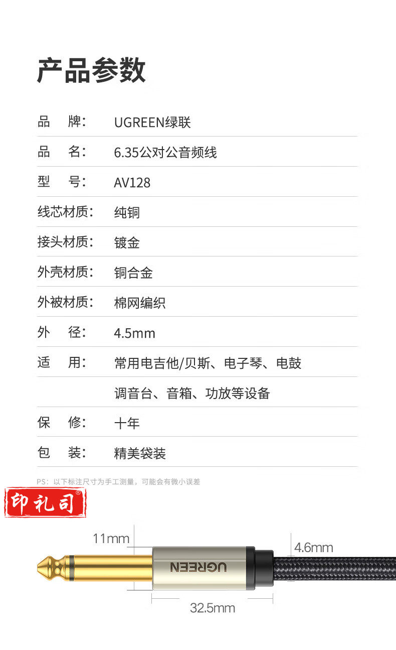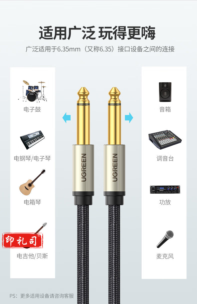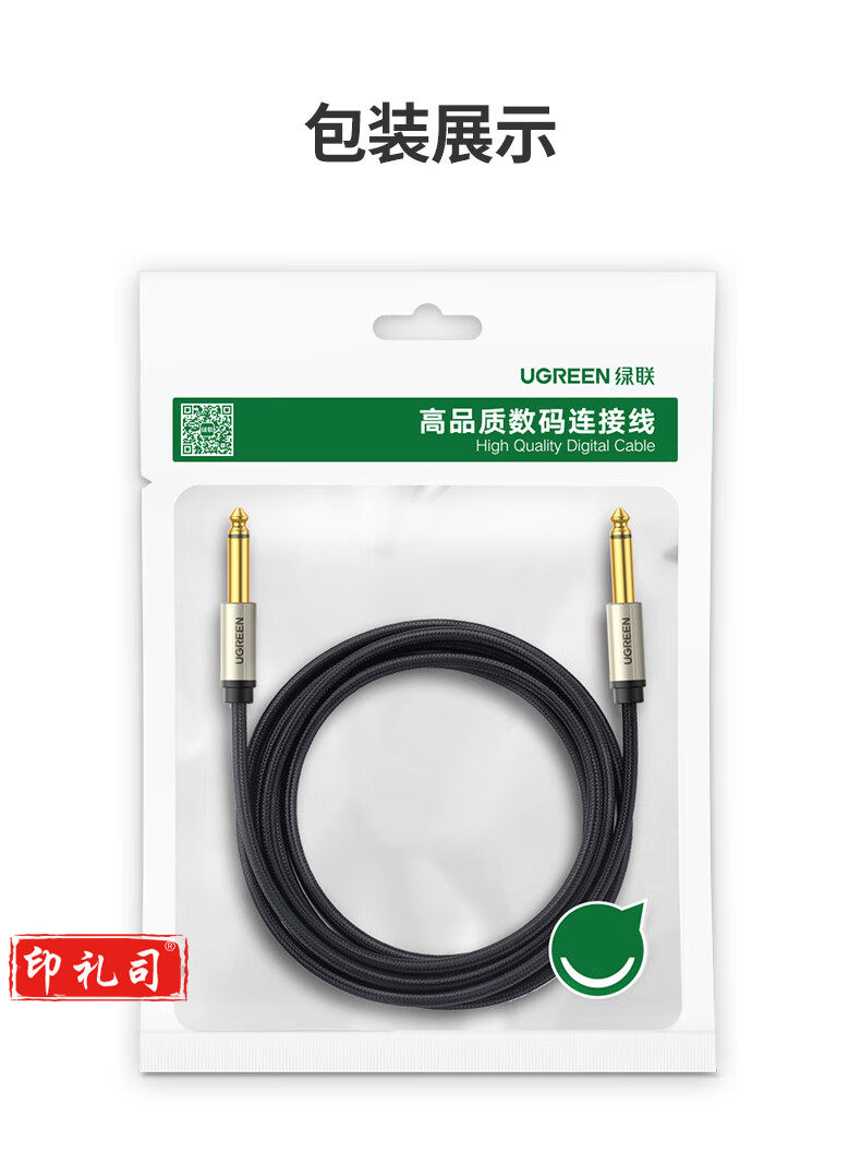 绿联6.5mm音频线6.35大二芯公对公连接线对录线 音响音箱功放麦克风电子琴鼓调音台转接线1米
