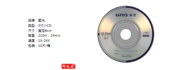 紫光(UNIS)CDR光盘 钻石系列 8CM(3寸)小盘 24速 刻录盘 空白光盘 碟片210M 桶装10片 A+