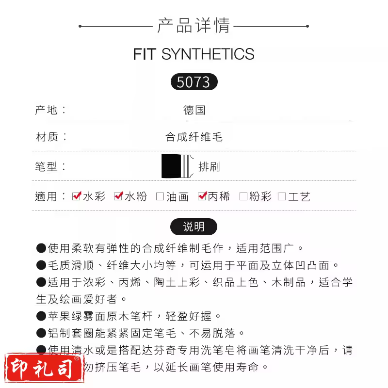 德国Da vinci达芬奇排刷5073水彩铺色笔刷进口绘画用排刷专业刷子50#刷毛宽5cm长2.7cm