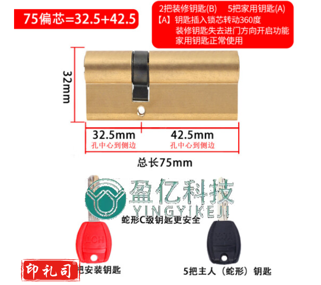 京顿铜制AB锁芯75mm正芯37.5+37.5铜制AB锁芯75mm偏芯32.5+42.5铜制防盗门大门入户门锁双面防撬铜弹子通用型