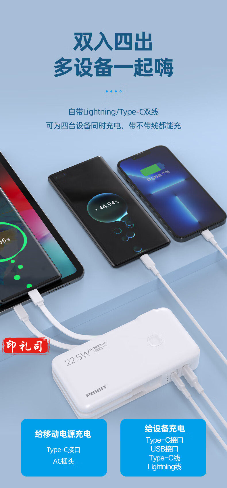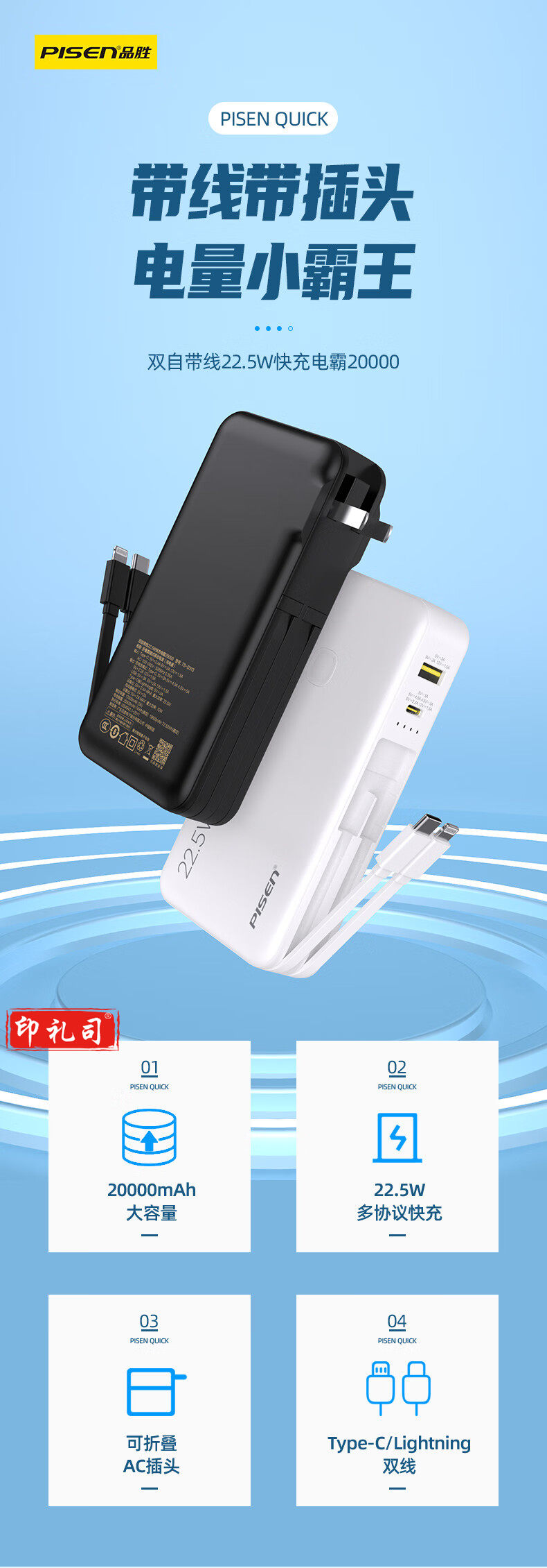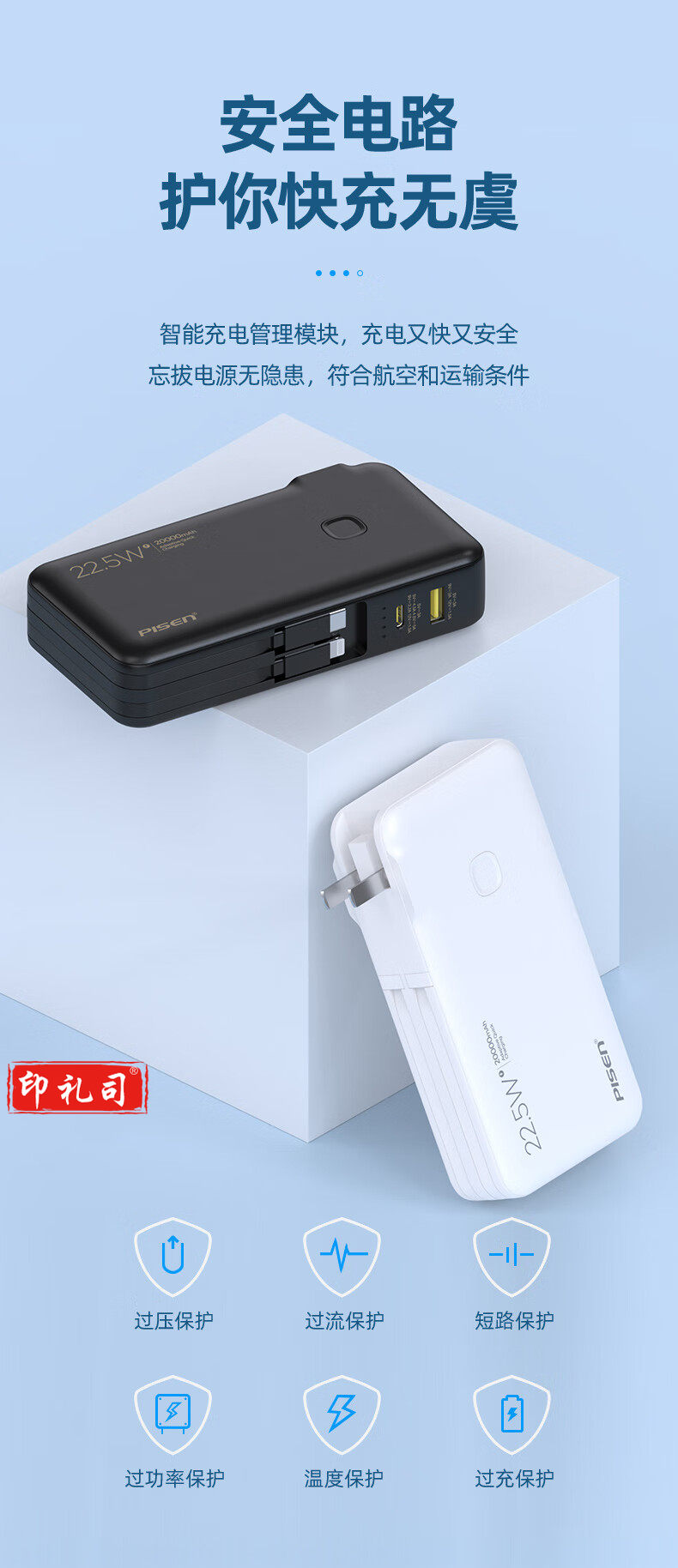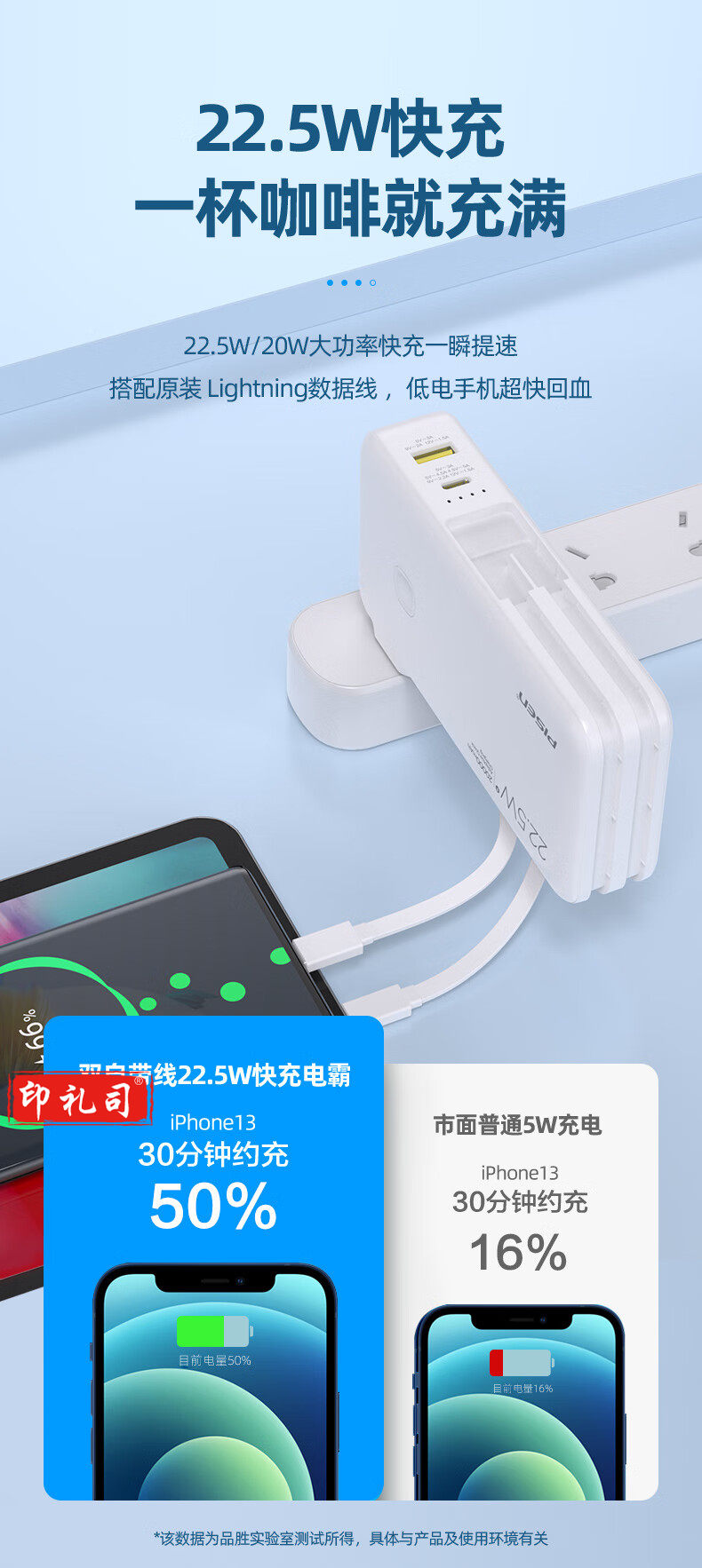 品胜自带双线充电宝20000毫安时大容量22.5W快充插头充电器二合一便携小巧户外移动电源适用苹果14华为小米白