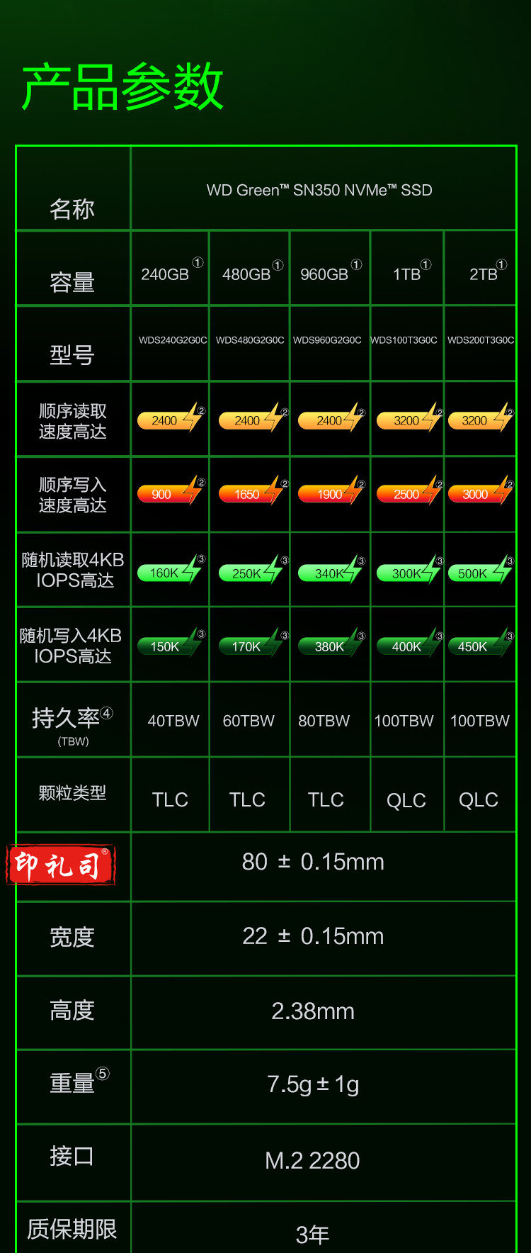 西部数据(Western Digital)1T SSD固态硬盘 M.2接口(NVMe协议) WD Green SN350 四通道PCIe 高速