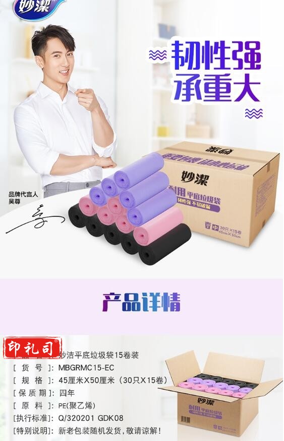 妙洁中号加厚平口垃圾袋 点断式紫粉黑色厨余办公室做好干湿垃圾分类 45*50cm450只箱装