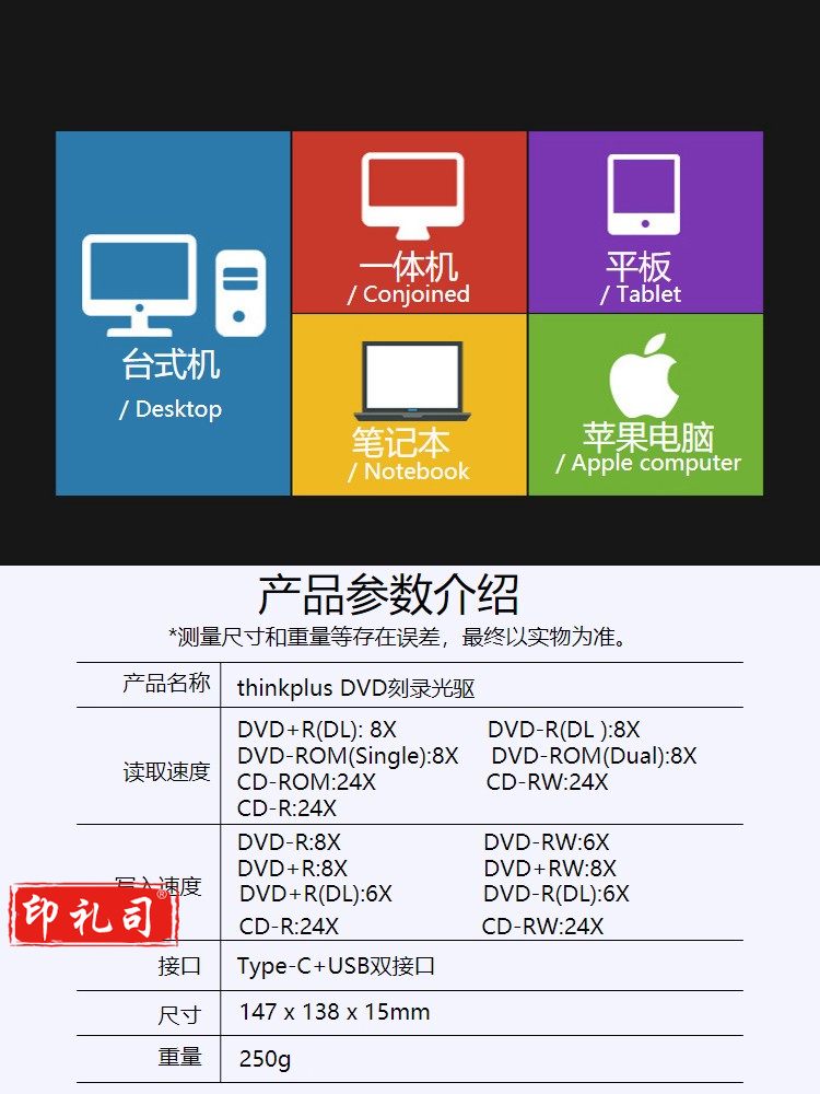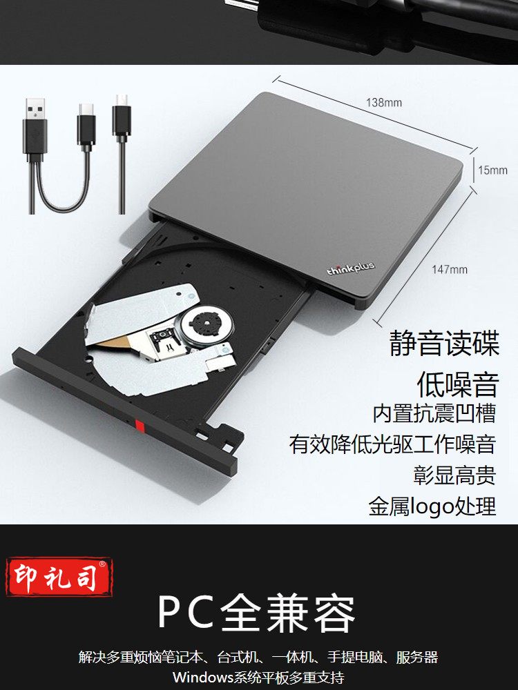 联想Think thinkplus 外置移动光驱光盘dvd刻录机笔记本电脑外置usb光驱超薄 4XA0F33838/4XA0E97775黑色
