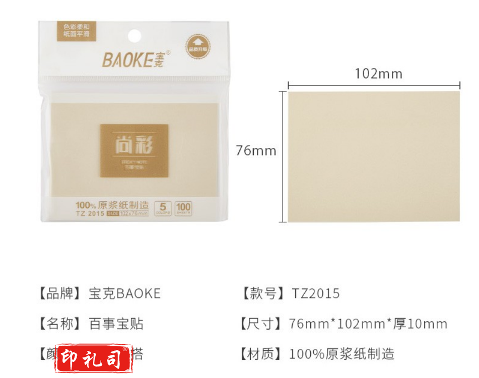 宝克(BAOKE)TZ2015百事贴 便利贴 彩色留言纸 便签标签纸 作业贴可重复自粘便条纸 学习办公用品文具 102×76mm 单包/5色