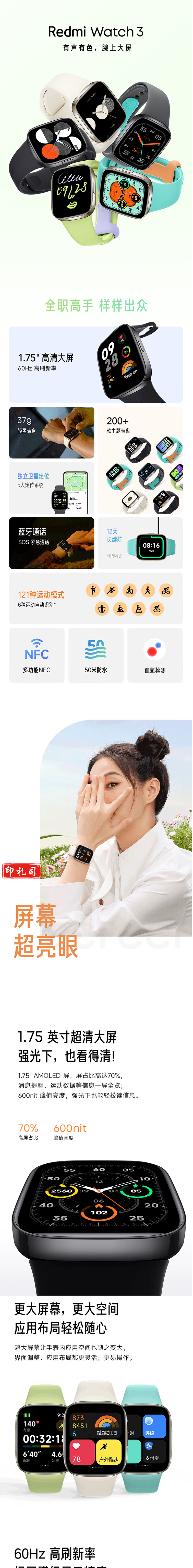 小米(MI)Redmi watch3 红米智能手表 蓝牙通话 高清大屏 NFC运动手表