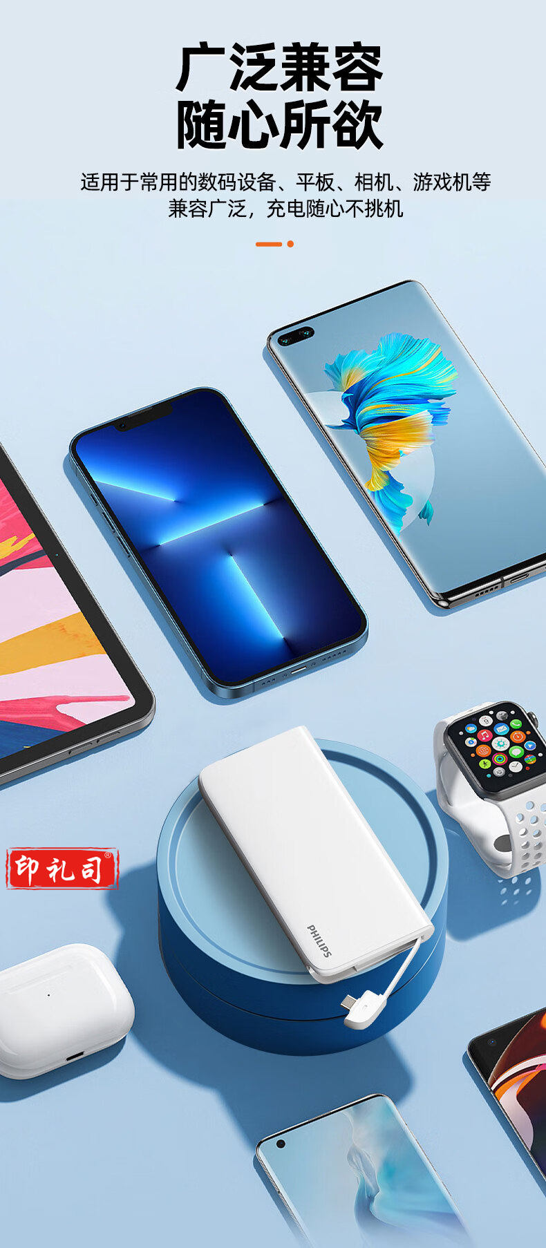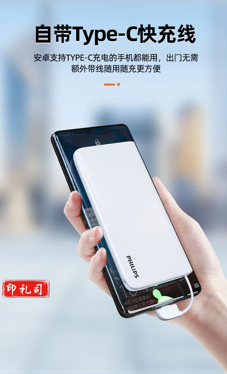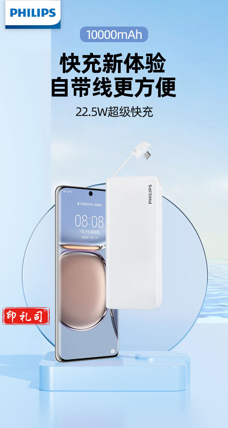 飞利浦充电宝自带线10000毫安时超薄小巧便携22.5W超级快充PD20W快充大容量移动电源适用于苹果13安卓手机