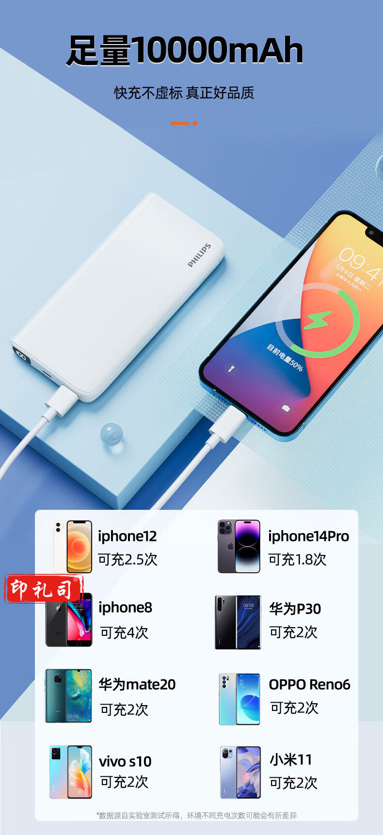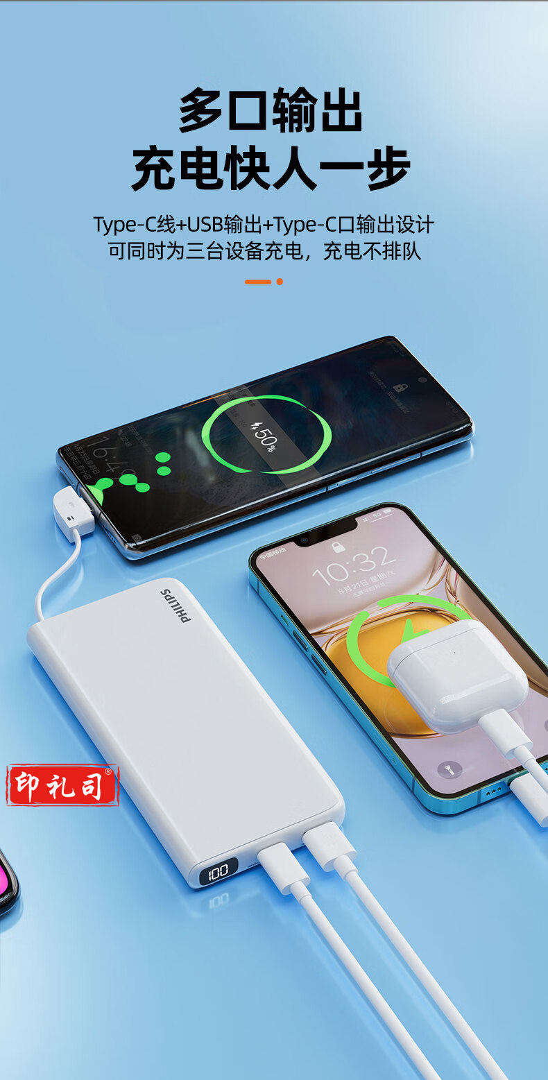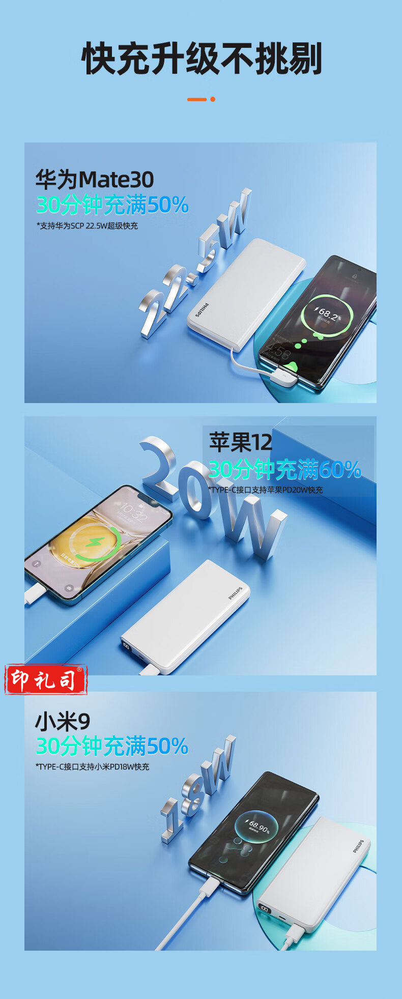飞利浦充电宝自带线10000毫安时超薄小巧便携22.5W超级快充PD20W快充大容量移动电源适用于苹果13安卓手机