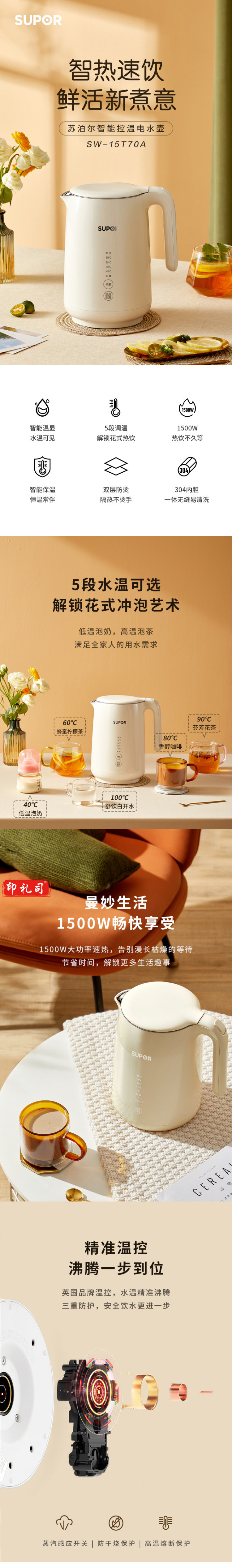 苏泊尔 SUPOR SW-15T70A 1.5L容量烧水壶 数字显温 触控操作 5段调温电热水壶保温电水壶