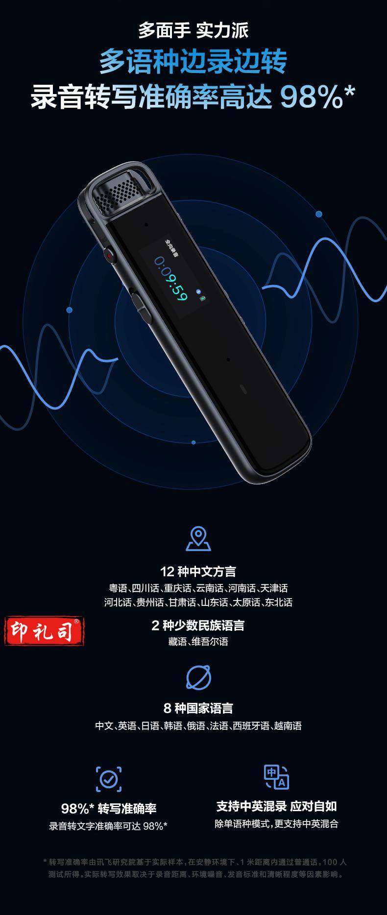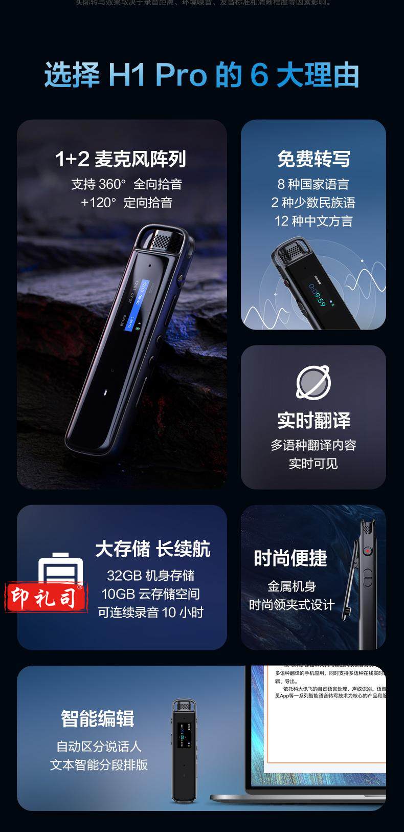 科大讯飞智能录音笔H1 Pro 转写助手 32G 专业高清降噪 会议录音转文字 录音笔 实时翻译