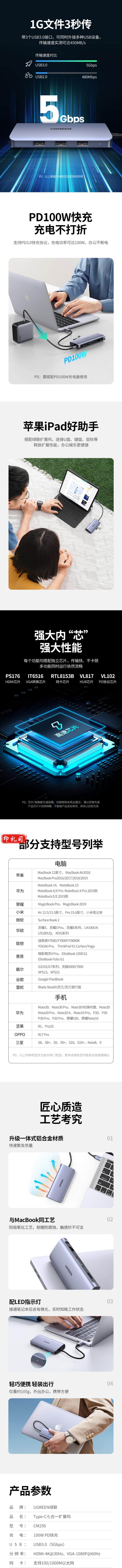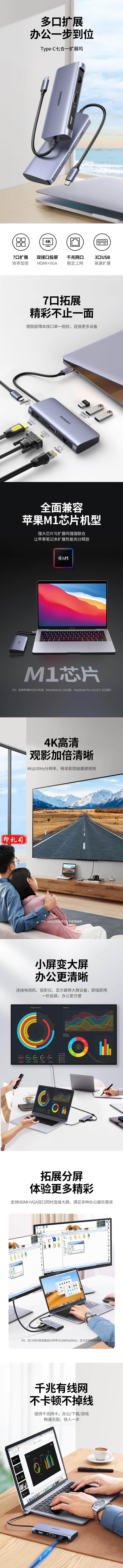绿联Type-C扩展坞 USB-C转HDMI/VGA转换器千兆网卡网线口转接头分线器 适用苹果华为笔记本电脑iPad拓展坞 60557
