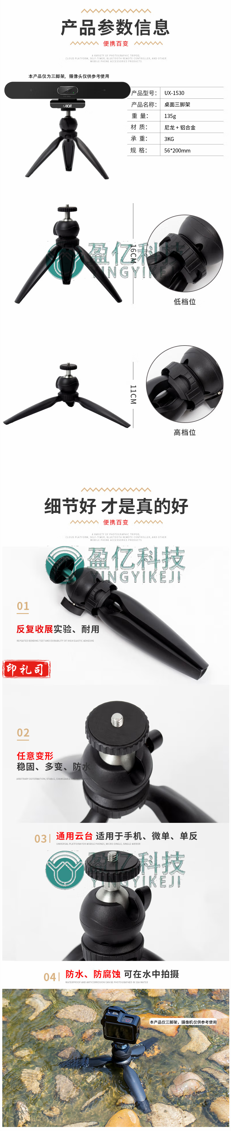 桌面三脚架摄像机/单反/微单/通用承重3KG 便携三脚架UX-1530