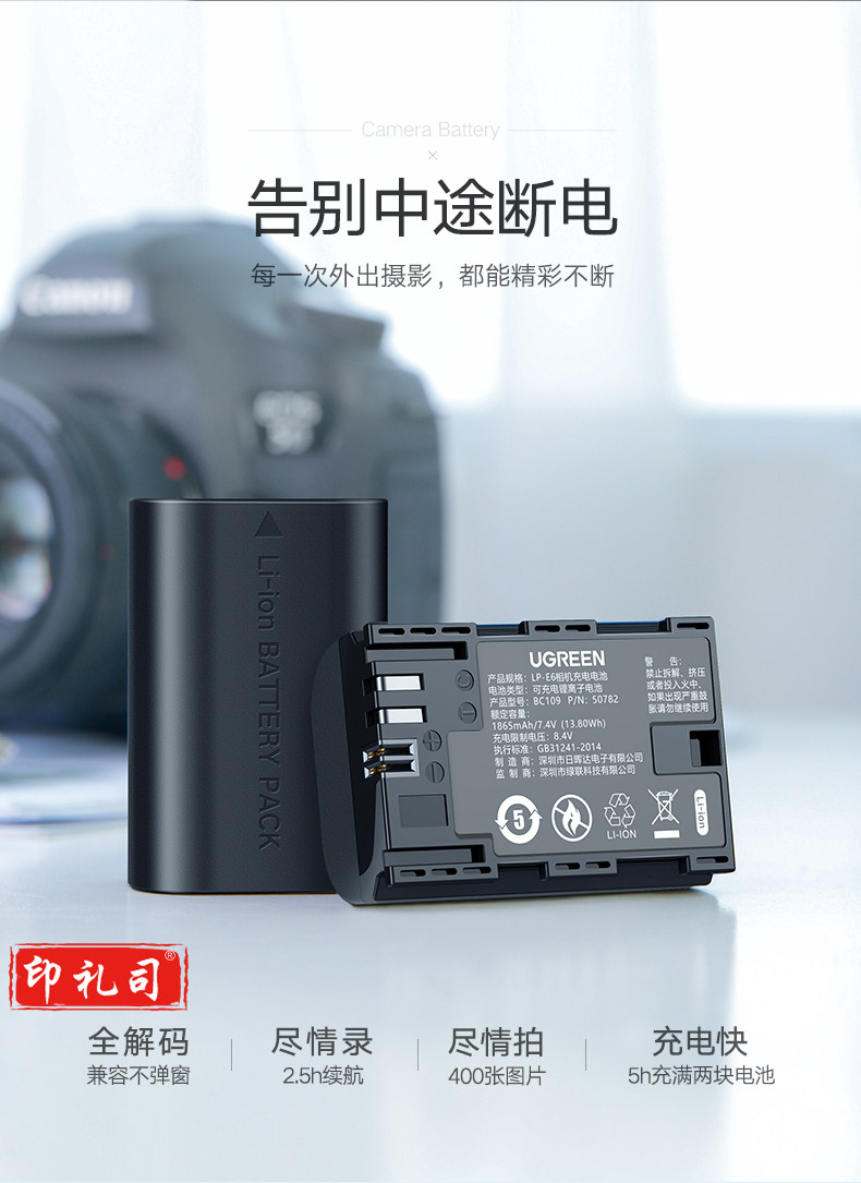 绿联LP-E6 相机电池 适用佳能EOS 90D 80D 70D 7D2 60D 6D2 5D3 5D2 5DSR 5DMark 5D4单反相机 单电池