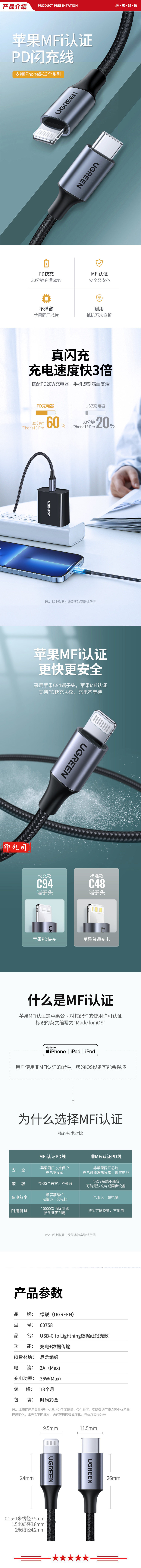 绿联 UGREEN US304/60759 MFi认证苹果编织数据线 通用iPhone Type-C to Lightning充电线 1米/暗夜绿