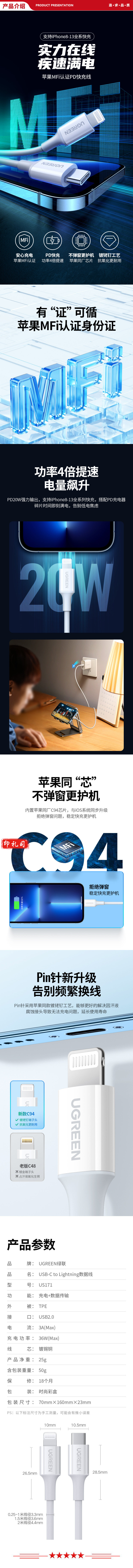 绿联 UGREEN US171/60748 Type-C转lightning转换线 苹果PD快充数据线 MFi认证Type-C通用iPhone手机 1.5米/白色