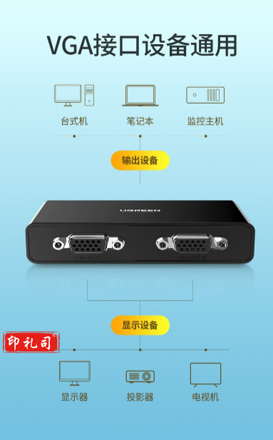 绿联 VGA分配器一进二出笔记本电脑投影显示器分屏器一分二 1080P高清视频转换器共享同屏器 1080P@60Hz 配1米电源线