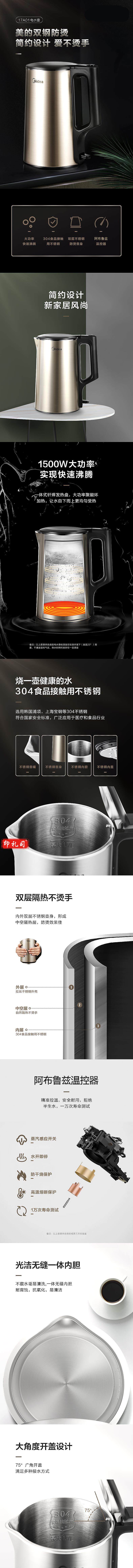 美的(Midea)PJ17A01 电热水壶 家用1.7L热水壶 304不锈钢开水壶