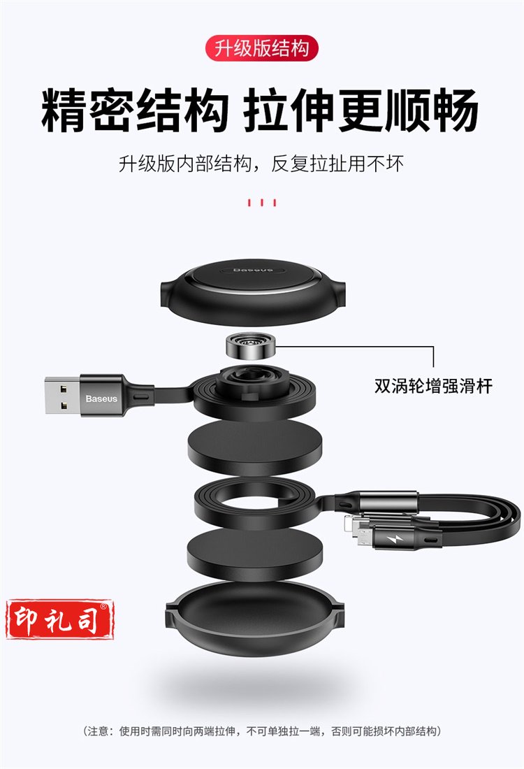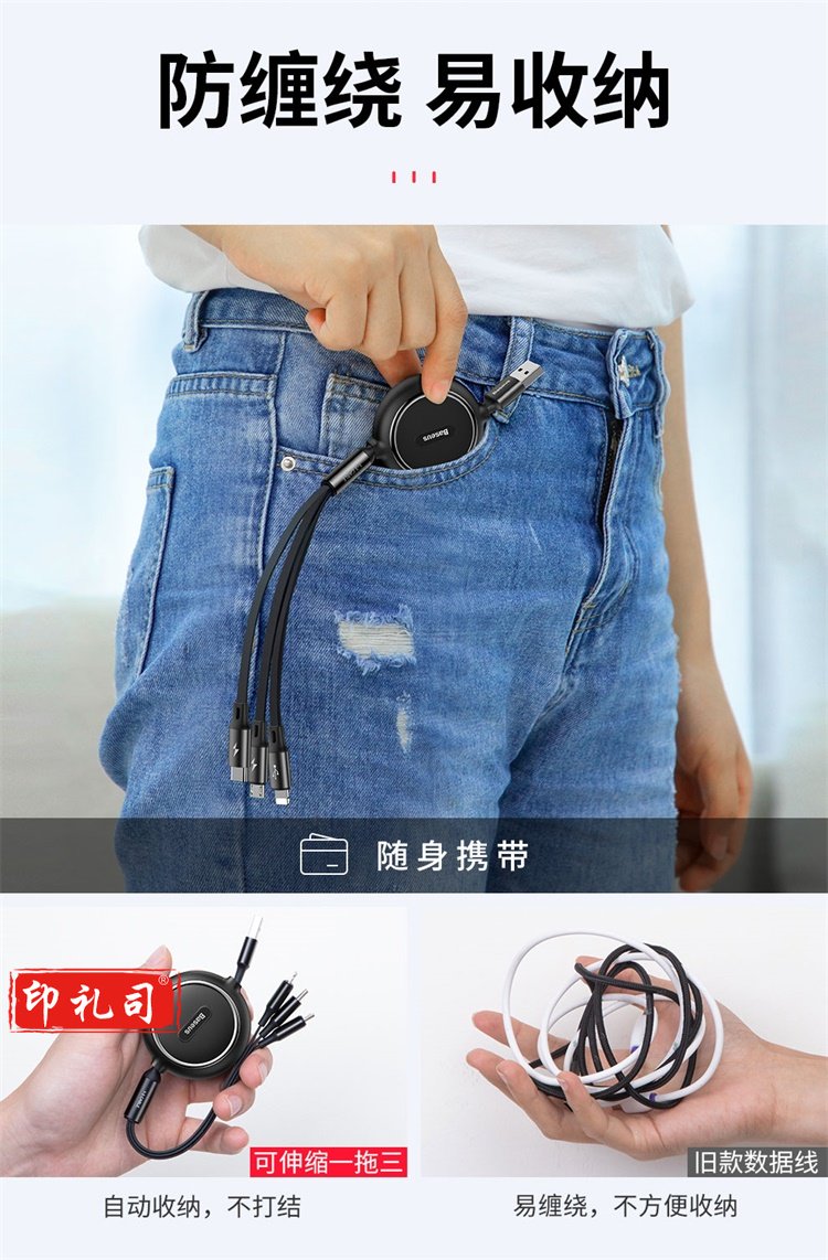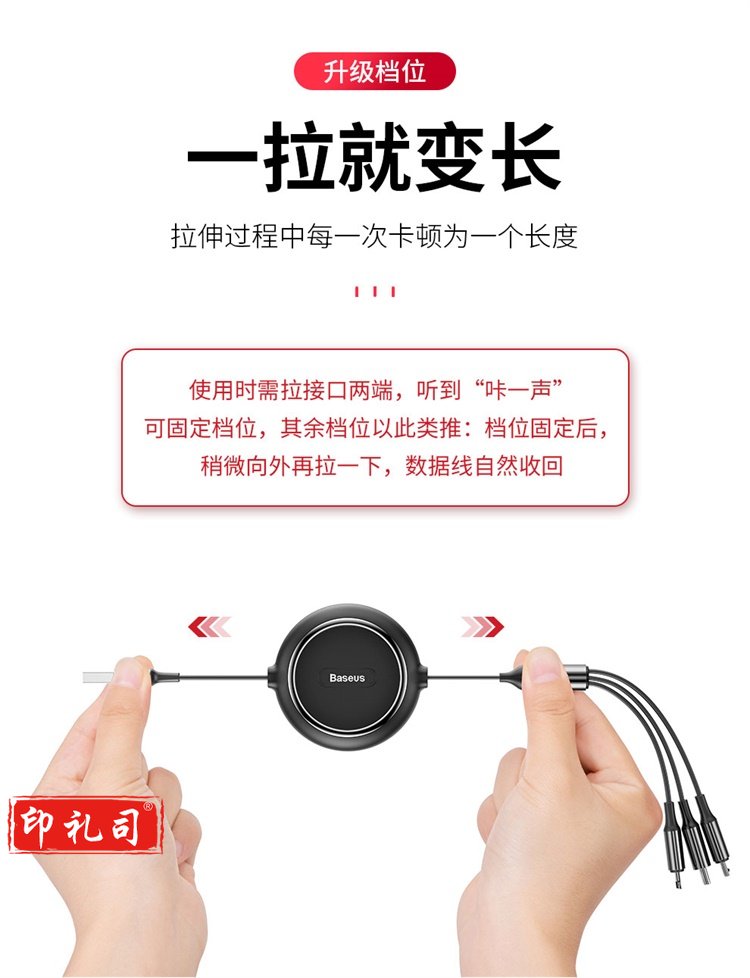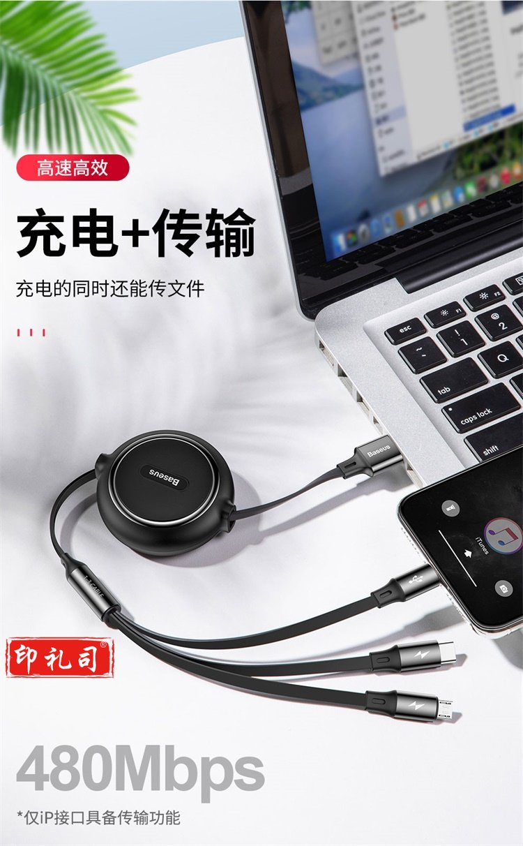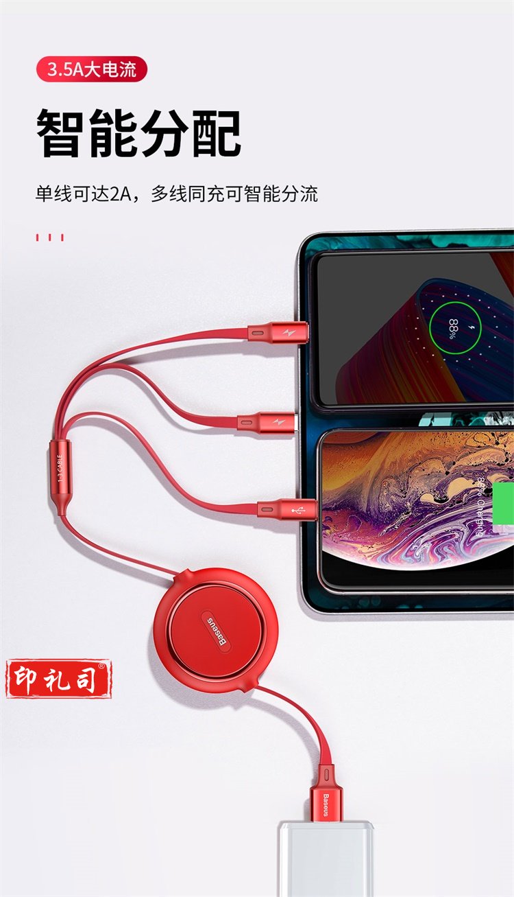 倍思 三合一伸缩数据线 苹果安卓type-c一拖三快充 适用iphone13/12/11/XR小米华为车载手机充电器线USB-M+L+T 1.2米红