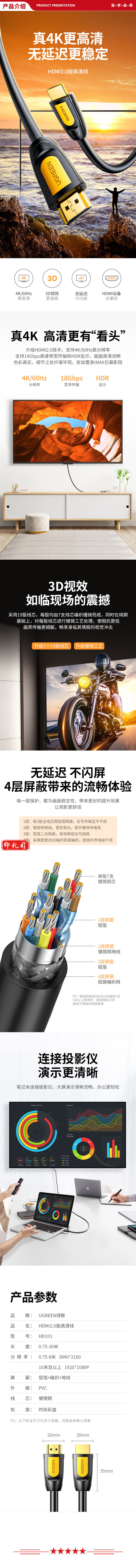 绿联 UGREEN 11182 HDMI线2.0版 HD101 4K数字高清连接线 黄黑扁线 8米