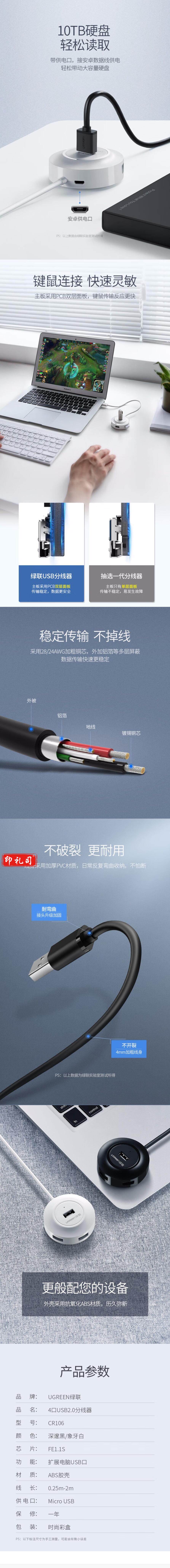 绿联 CR106 1.5米 USB2.0分线器4口带micro usb供电接口 Type-C笔记本一拖四转换器 黑色