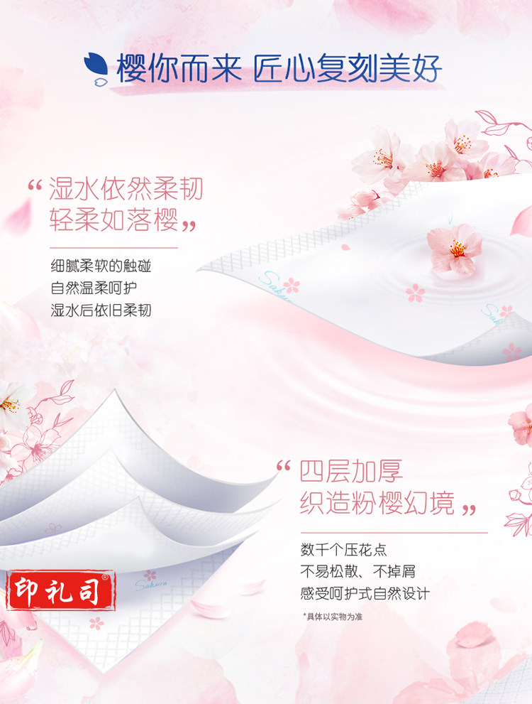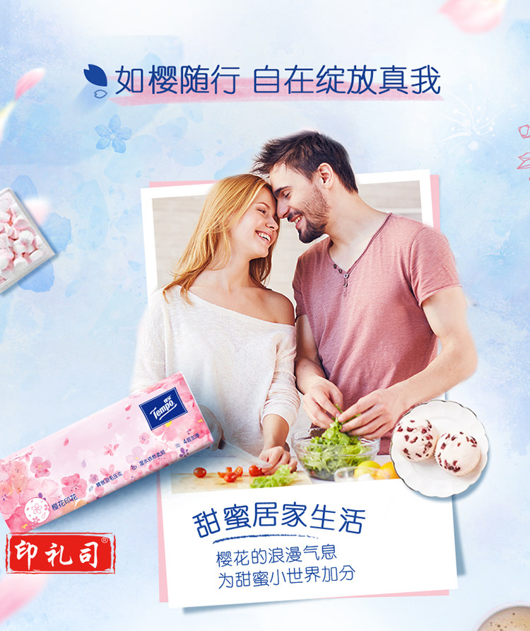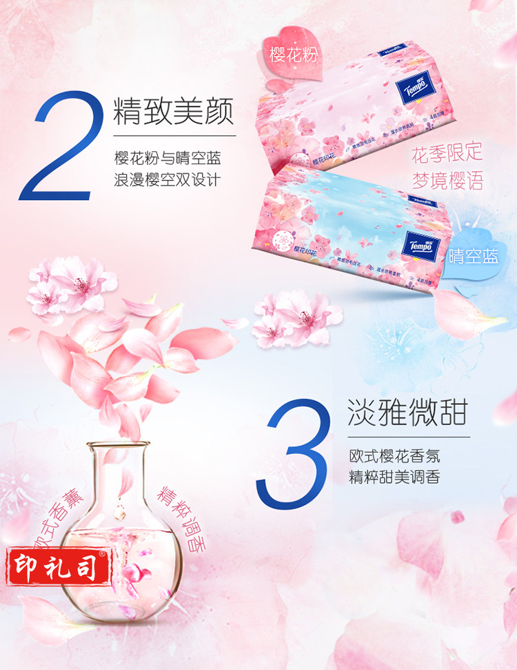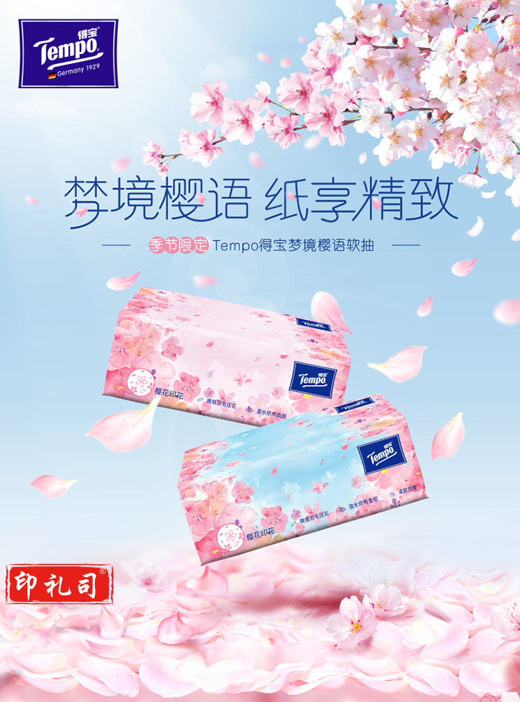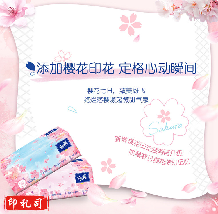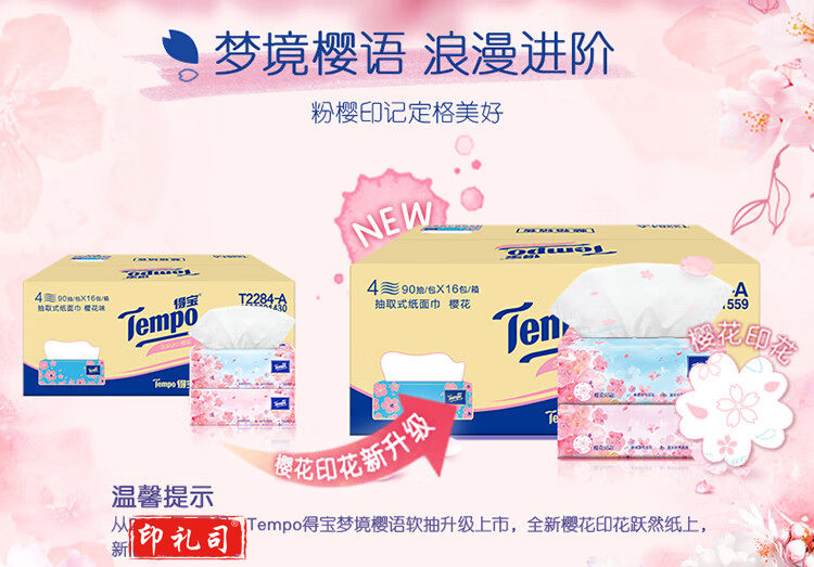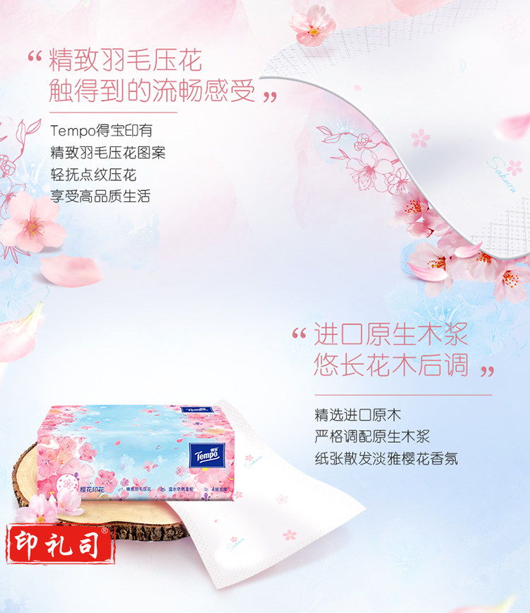 得宝(TEMPO)抽纸 樱花味4层加厚90抽*16包湿水柔韧 纸巾 餐巾纸(箱)