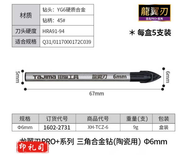 田岛三角合金钻瓷砖钻头陶瓷玻璃钻头打孔黑漆防锈陶瓷钻 合金三角钻6mm5支装1602-2731