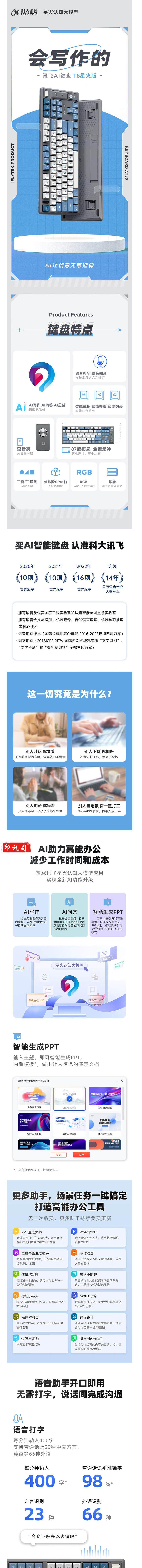科大讯飞 AI智能键盘 机械键盘 无线蓝牙键盘 AI写作问答智能PPT 全键无冲 三模连接 T8星火版