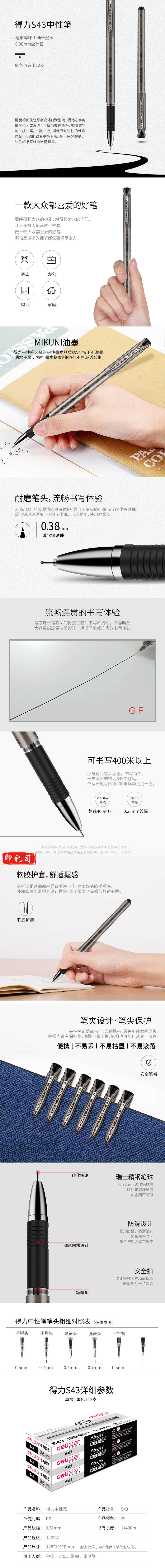 得力S43中性笔0.38mm全针管(黑)(12支) 支