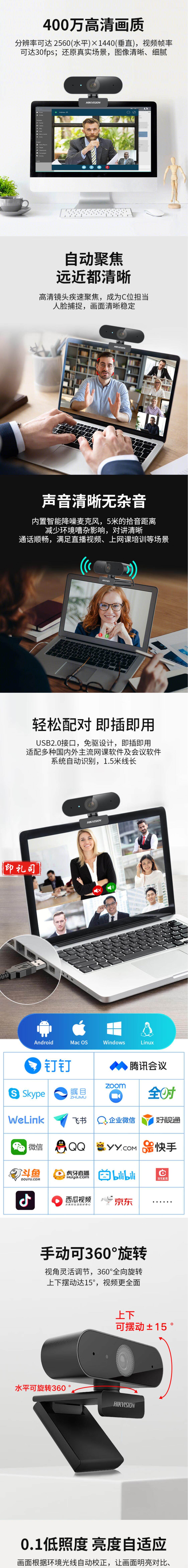 海康威视 400万超高清USB电脑摄像头内置麦克风即插即用DS-E14a