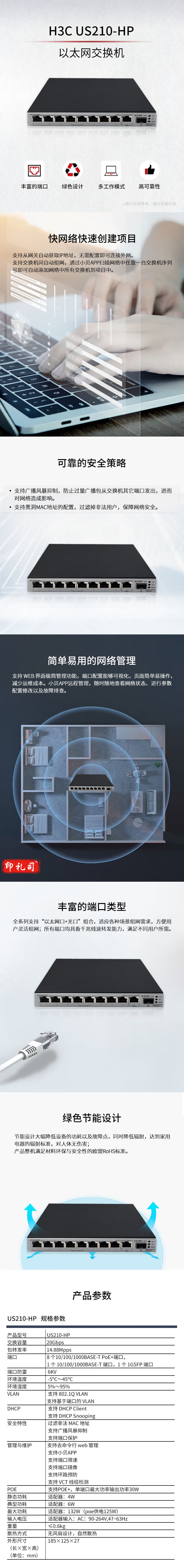 H3C新华三US210-HP新一代绿色节能 WEB界面极简管理125W POE交换机(9千兆电(含8PoE+端口)+1千兆光)