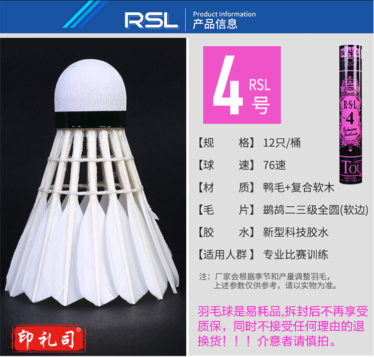 亚狮龙(RSL)羽毛球专业比赛鸭毛稳定耐打RSL4号76速12只装/桶