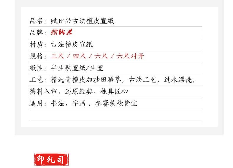 赋比兴宣纸 书法作品纸 4年陈生宣纸 安徽泾县书法国画专用生宣纸四尺六尺三尺加厚毛笔练习比赛用纸 六尺生宣(97*183cm)50张