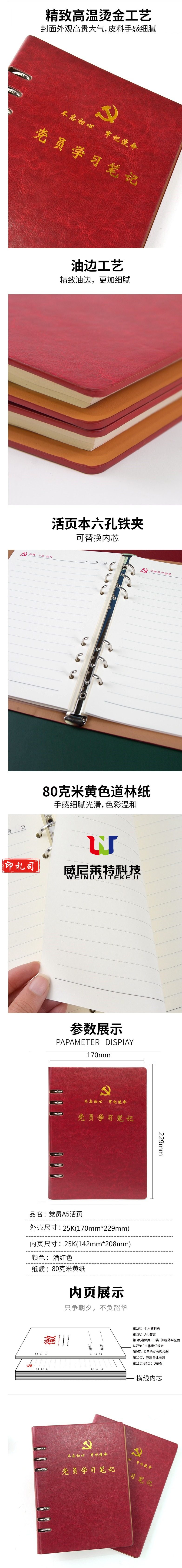 A5活页本_党员学习笔记本_6孔党员学习笔记(酒红色)(承接:笔记本定制)