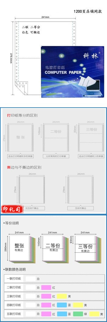 科林电脑打印纸241-2联两层二等分打印纸1200页全白可撕边