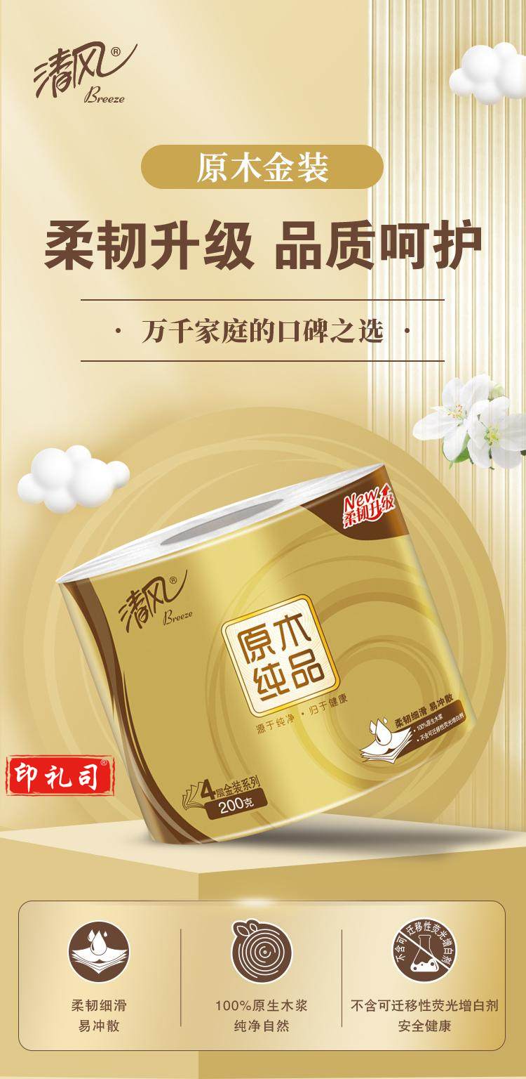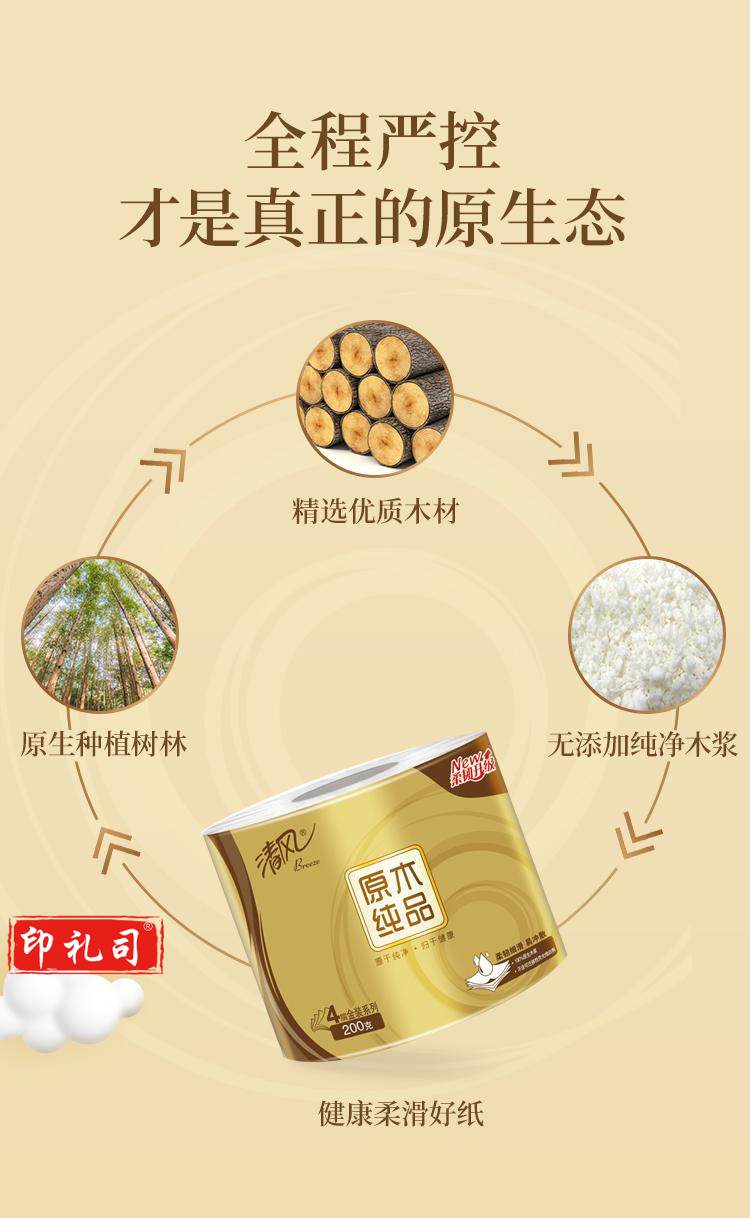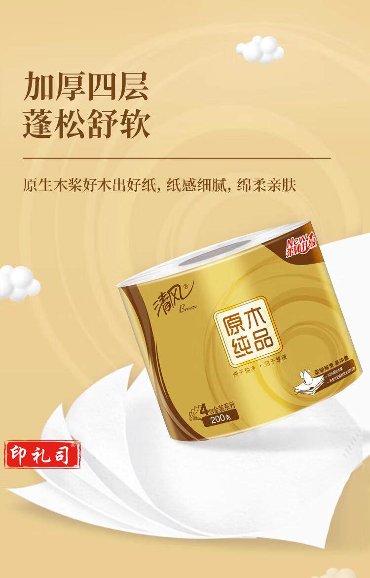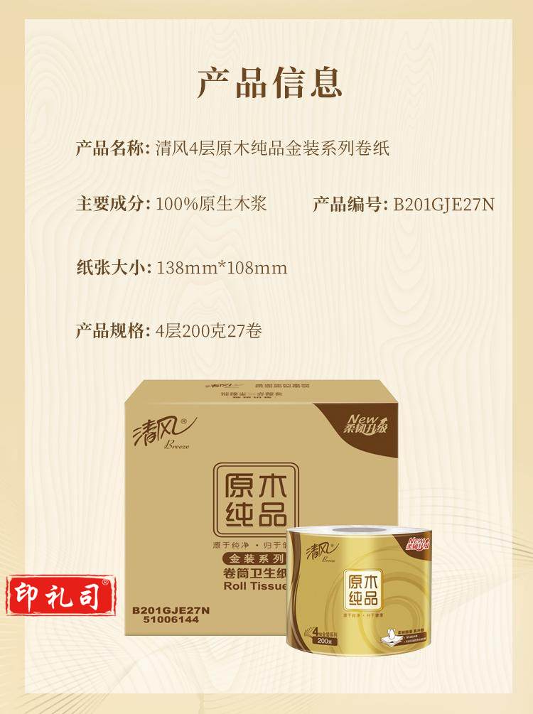 清风有芯卷纸 原木金装4层加厚200克*27卷 卫生纸卷筒纸纸巾卷纸整箱