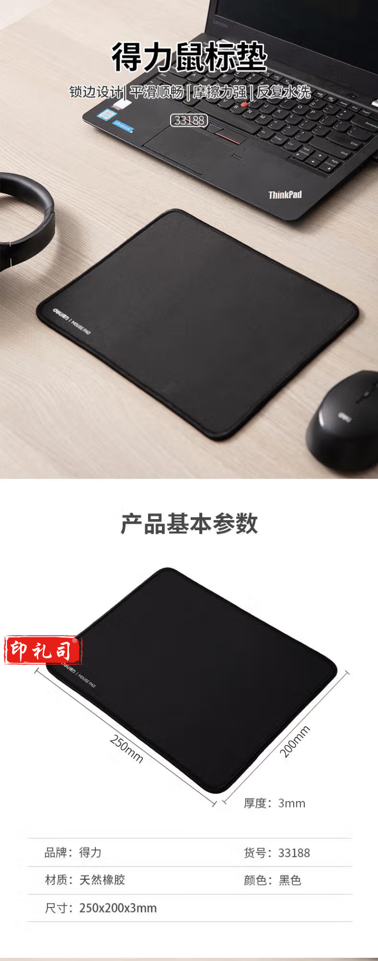 得力(deli)33188 鼠标垫 锁边鼠标垫平顺耐用加厚鼠标垫 黑色 230206101633