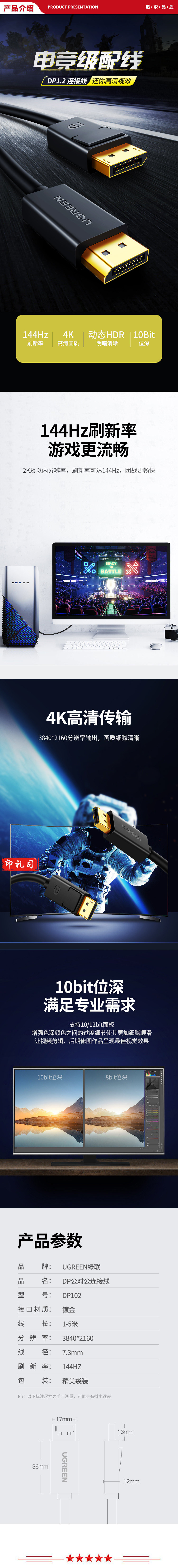 绿联 UGREEN 10245 DP线1.2版 DP102 4K高清DisplayPort公对公144Hz视频连接线 1.5米 单位:条 240312163403