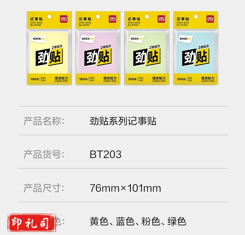 得力BT203劲贴记事贴76mm×101mm100张(彩色)(本)