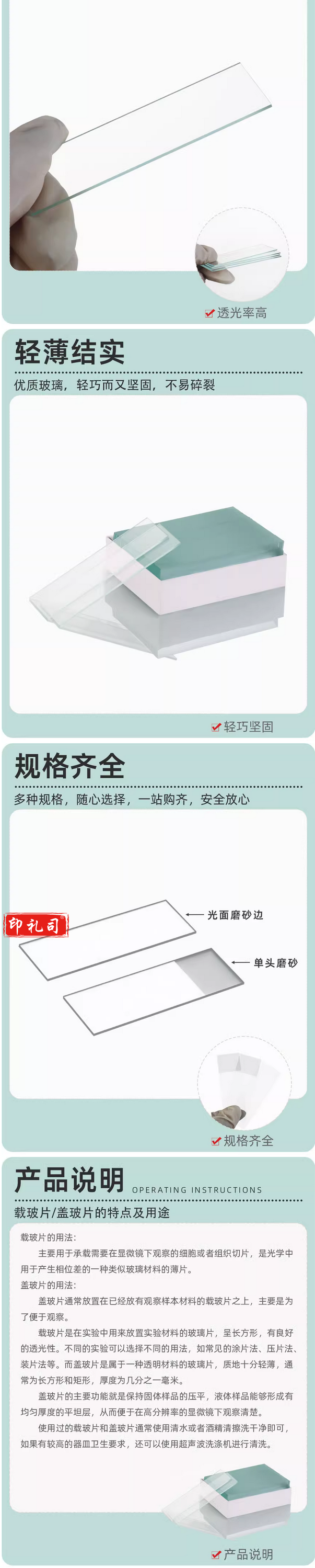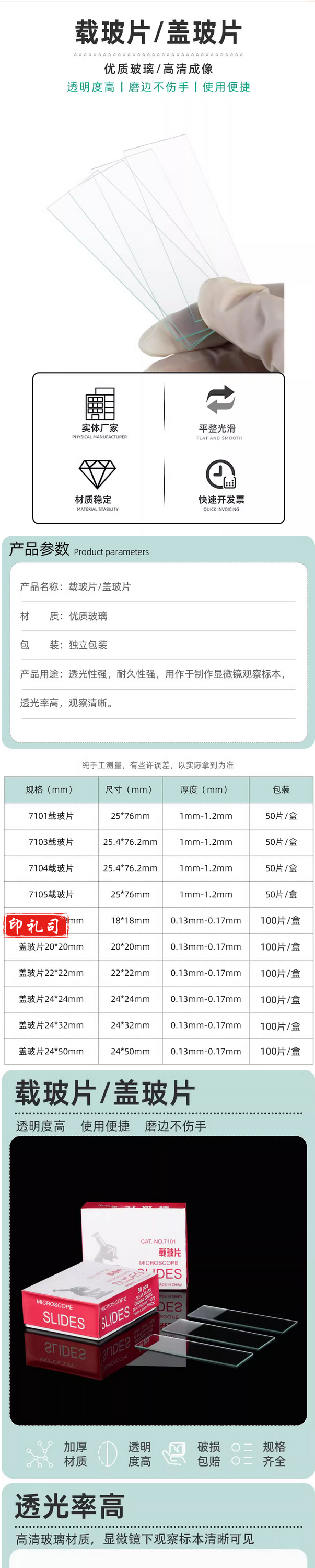 载玻片盖玻片生物玻片显微镜玻璃光面磨砂面载玻片7101 20*20生物实验切片实验耗材