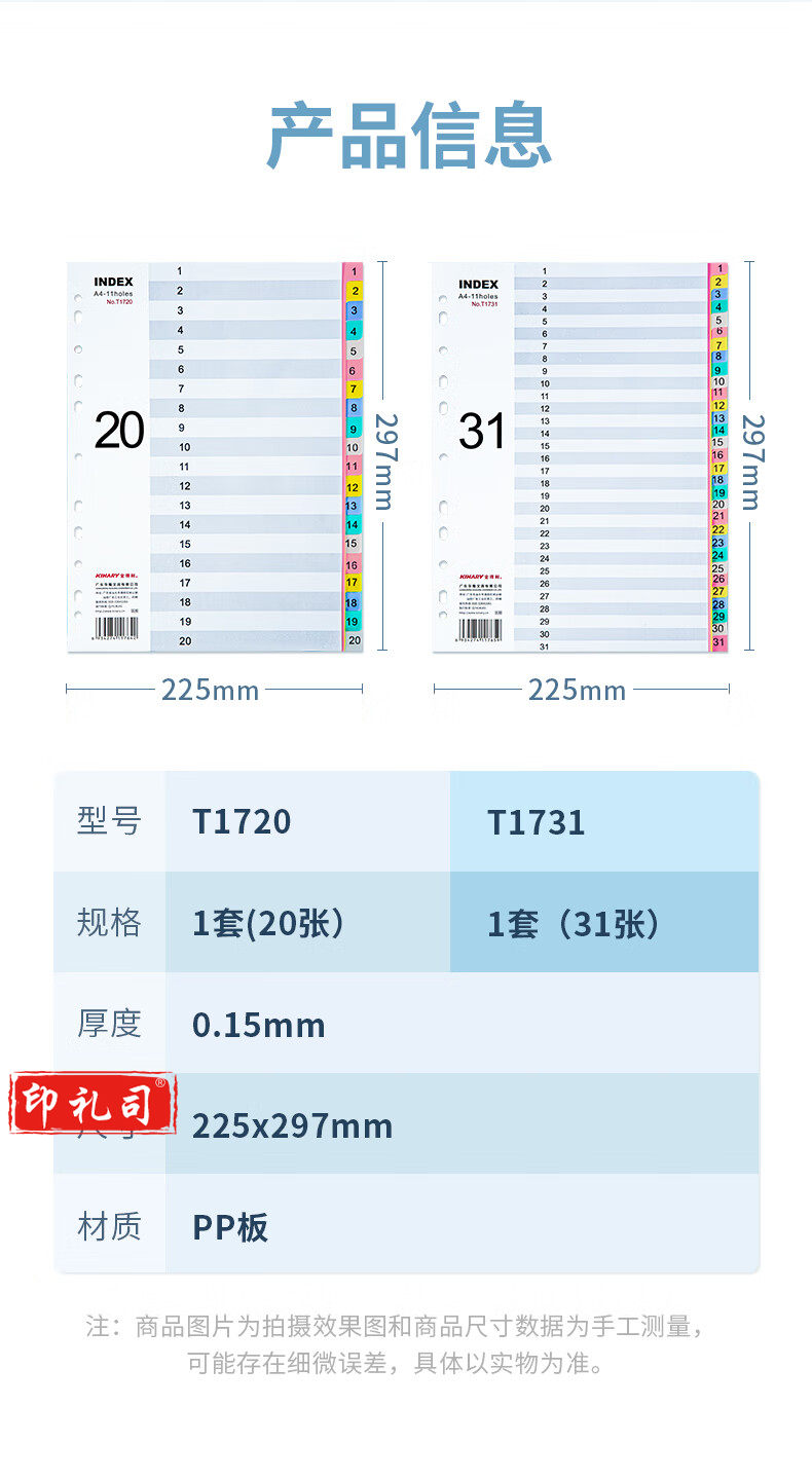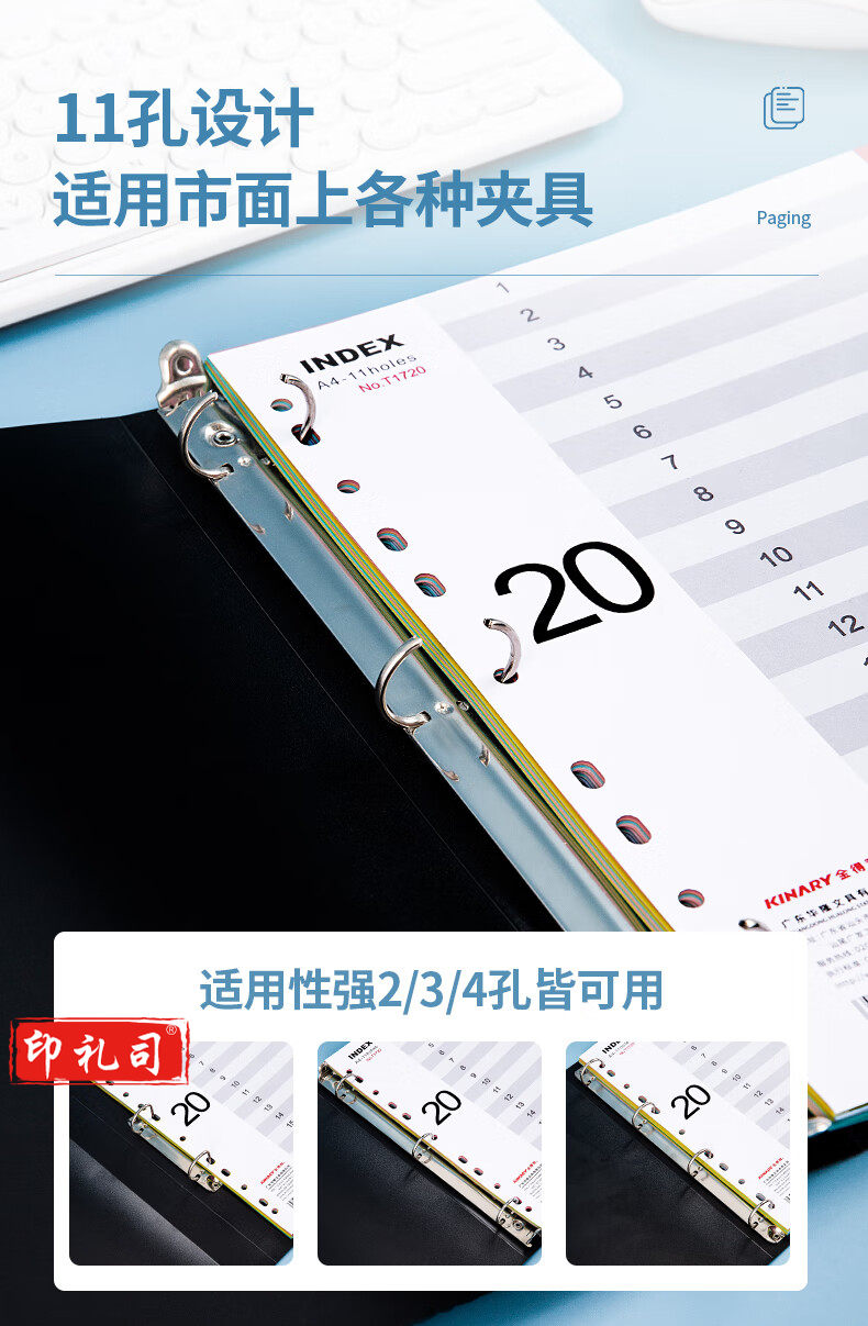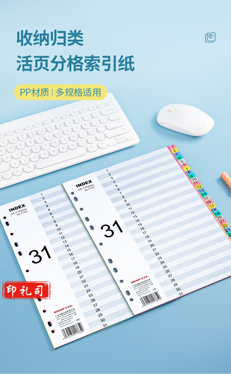 金得利11孔分页卡a-4隔页纸31页1套彩色index数字索引卡文件夹活页纸塑料pp分类卡目录页标签办公用品T1731