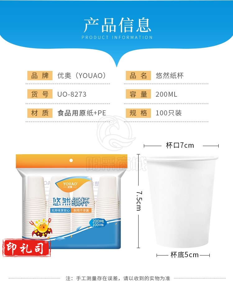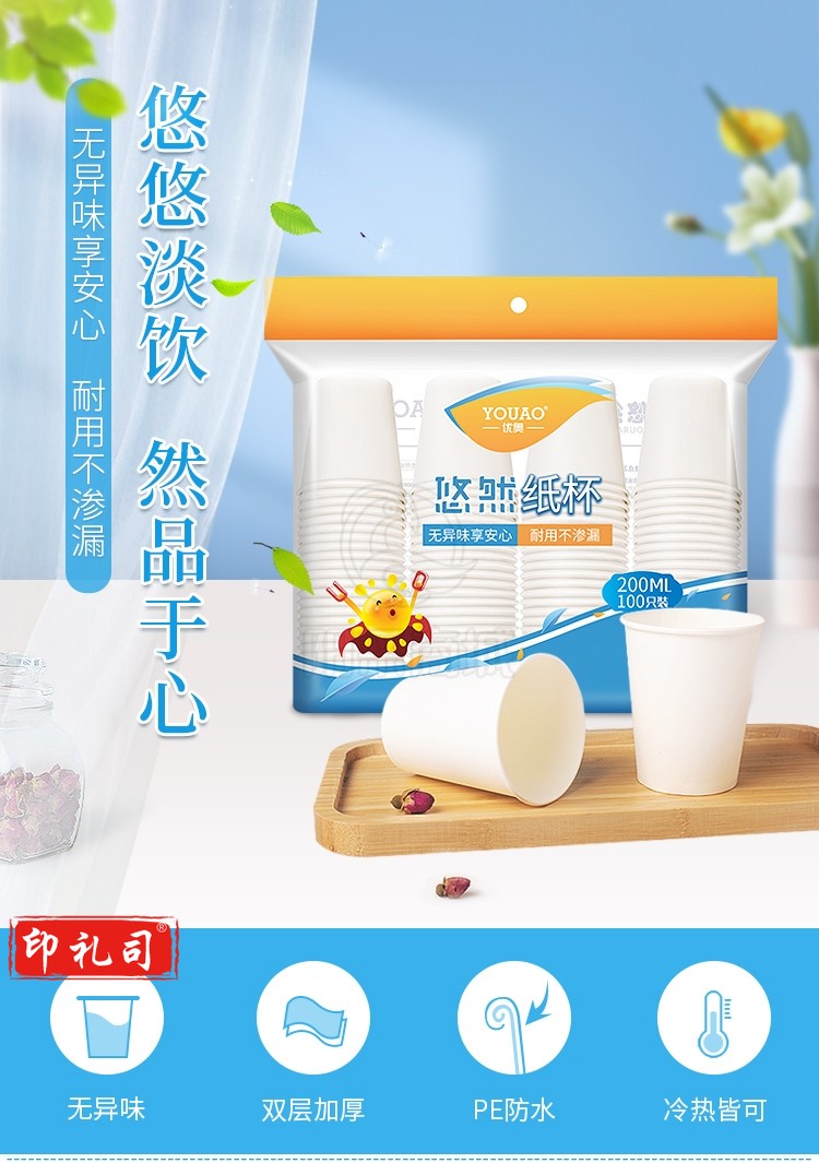 优奥(YOUAO)悠然纸杯 200ML*100只
