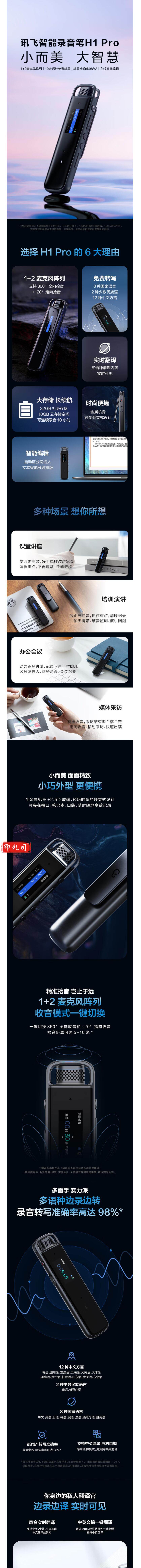 科大讯飞 智能录音笔H1 Pro听见转写助手32G专业高清降噪会议录音转文字翻译 讯飞智能录音笔
