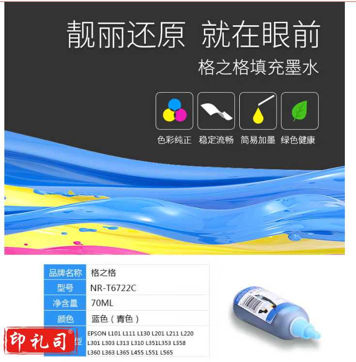 格之格T672墨水适用爱普生打印机墨水L360 L310 L301 L303 L313 L1300墨盒T6722C青色