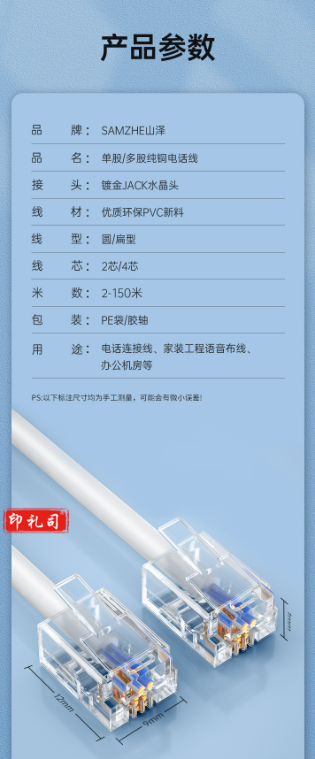 山泽电话线DH-4010L 4芯多股6P4C纯铜语音跳线 座机延长线连接线 成品电话线带水晶头 10米