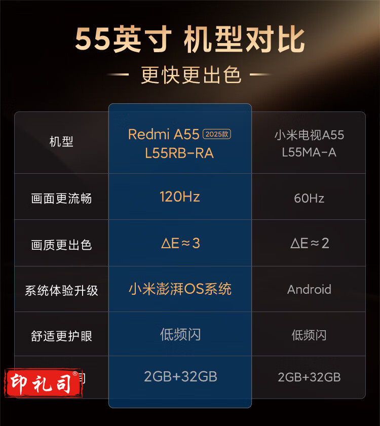 小米55英寸2025款120Hz2+32GB4K超高清小米澎湃OS平板RedmiA55L55RB-RA